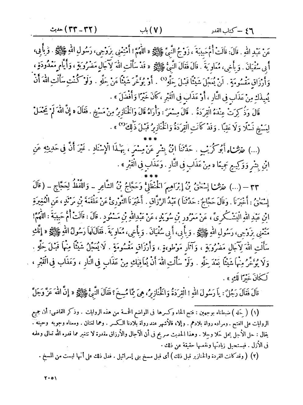 ٣٣ - (٢٦٦٣) حَدَّثَنَا إِسْحَاقُ بْنُ إِبْرَاهِيمَ الْحَنْظَلِيُّ، وَحَجَّاجُ بْنُ الشَّاعِرِ - وَاللَّفْظُ لِحَجَّاجٍ، قَالَ إِسْحَاقُ: أَخْبَرَنَا وقَالَ حَجَّاجٌ: حَدَّثَنَا - عَبْدُ الرَّزَّاقِ، أَخْبَرَنَا الثَّوْرِيُّ، عَنْ عَلْقَمَةَ بْنِ مَرْثَدٍ، عَنِ الْمُغِيرَةِ بْنِ عَبْدِ اللهِ الْيَشْكُرِيِّ، عَنْ مَعْرُورِ بْنِ سُوَيْدٍ، عَنْ عَبْدِ اللهِ بْنِ مَسْعُودٍ، قَالَ: قَالَتْ أُمُّ حَبِيبَةَ: اللهُمَّ مَتِّعْنِي بِزَوْجِي رَسُولِ اللهِ صَلَّى اللهُ عَلَيْهِ وَسَلَّمَ، وَبِأَبِي أَبِي سُفْيَانَ، وَبِأَخِي مُعَاوِيَةَ، فَقَالَ لَهَا رَسُولُ اللهِ صَلَّى اللهُ عَلَيْهِ وَسَلَّمَ: «إِنَّكِ سَأَلْتِ اللهَ لِآجَالٍ مَضْرُوبَةٍ، وَآثَارٍ مَوْطُوءَةٍ، وَأَرْزَاقٍ مَقْسُومَةٍ، لَا يُعَجِّلُ شَيْئًا مِنْهَا قَبْلَ حِلِّهِ، وَلَا يُؤَخِّرُ مِنْهَا شَيْئًا بَعْدَ حِلِّهِ، وَلَوْ سَأَلْتِ اللهَ أَنْ يُعَافِيَكِ مِنْ عَذَابٍ فِي النَّارِ، وَعَذَابٍ فِي الْقَبْرِ لَكَانَ خَيْرًا لَكِ» قَالَ فَقَالَ رَجُلٌ: يَا رَسُولَ اللهِ الْقِرَدَةُ وَالْخَنَازِيرُ، هِيَ مِمَّا مُسِخَ؟ فَقَالَ النَّبِيُّ صَلَّى اللهُ عَلَيْهِ وَسَلَّمَ: «إِنَّ اللهَ عَزَّ وَجَلَّ لَمْ يُهْلِكْ قَوْمًا، أَوْ يُعَذِّبْ قَوْمًا، فَيَجْعَلَ لَهُمْ نَسْلًا، وَإِنَّ الْقِرَدَةَ وَالْخَنَازِيرَ كَانُوا قَبْلَ ذَلِكَ»