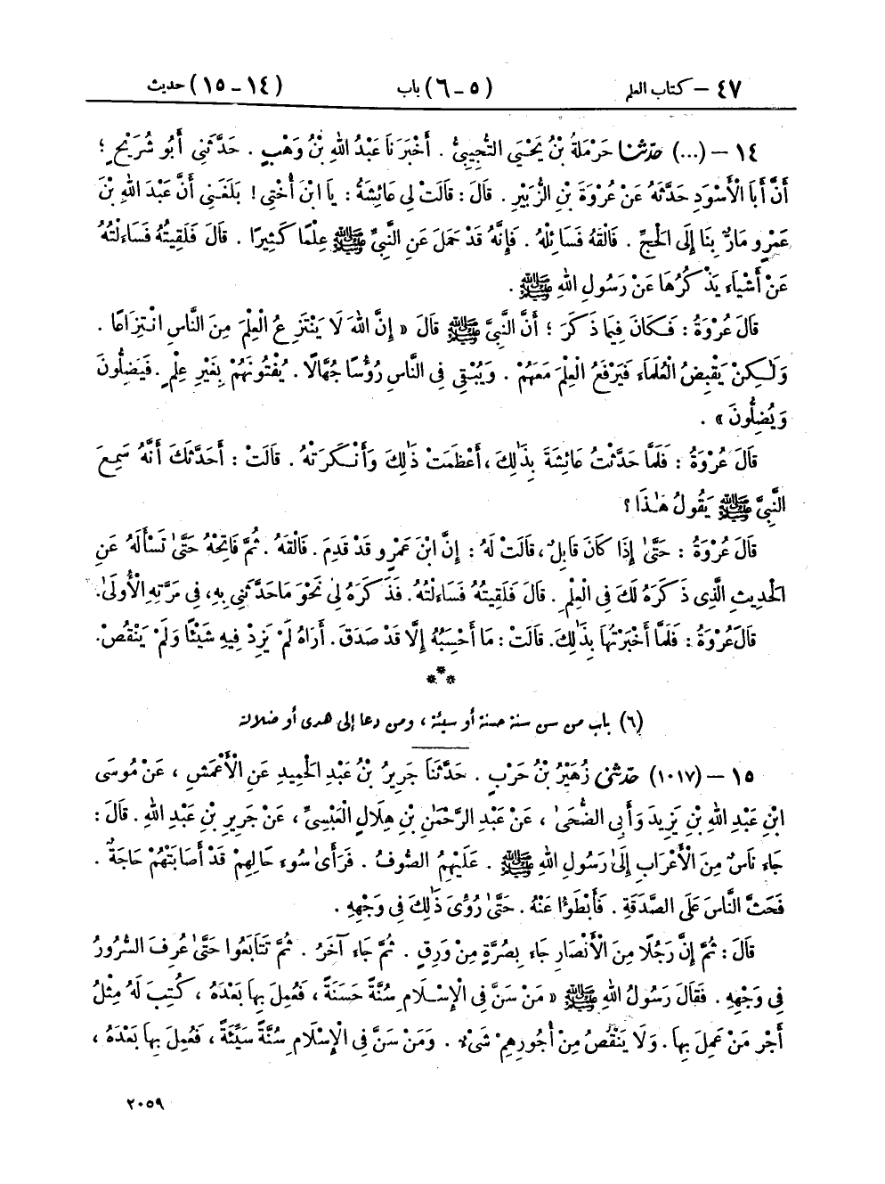 ١٥ - (١٠١٧) حَدَّثَنِي زُهَيْرُ بْنُ حَرْبٍ، حَدَّثَنَا جَرِيرُ بْنُ عَبْدِ الْحَمِيدِ، عَنِ الْأَعْمَشِ، عَنْ مُوسَى بْنِ عَبْدِ اللهِ بْنِ يَزِيدَ، وَأَبِي الضُّحَى، عَنْ عَبْدِ الرَّحْمَنِ بْنِ هِلَالٍ الْعَبْسِيِّ، عَنْ جَرِيرِ بْنِ عَبْدِ اللهِ، قَالَ: جَاءَ نَاسٌ مِنَ الْأَعْرَابِ إِلَى رَسُولِ اللهِ صَلَّى اللهُ عَلَيْهِ وَسَلَّمَ عَلَيْهِمِ الصُّوفُ فَرَأَى سُوءَ حَالِهِمْ قَدْ أَصَابَتْهُمْ حَاجَةٌ، فَحَثَّ النَّاسَ عَلَى الصَّدَقَةِ، فَأَبْطَئُوا عَنْهُ حَتَّى رُئِيَ ذَلِكَ فِي وَجْهِهِ. قَالَ: ثُمَّ إِنَّ رَجُلًا مِنَ الْأَنْصَارِ جَاءَ بِصُرَّةٍ مِنْ وَرِقٍ، ثُمَّ جَاءَ آخَرُ، ثُمَّ تَتَابَعُوا حَتَّى عُرِفَ السُّرُورُ فِي وَجْهِهِ، فَقَالَ رَسُولُ اللهِ صَلَّى اللهُ عَلَيْهِ وَسَلَّمَ: «مَنْ سَنَّ فِي الْإِسْلَامِ سُنَّةً حَسَنَةً، فَعُمِلَ بِهَا بَعْدَهُ، كُتِبَ لَهُ مِثْلُ أَجْرِ مَنْ عَمِلَ بِهَا، وَلَا يَنْقُصُ مِنْ أُجُورِهِمْ شَيْءٌ، وَمَنْ سَنَّ فِي الْإِسْلَامِ سُنَّةً سَيِّئَةً، فَعُمِلَ بِهَا بَعْدَهُ، كُتِبَ عَلَيْهِ مِثْلُ وِزْرِ مَنْ عَمِلَ بِهَا، وَلَا يَنْقُصُ مِنْ أَوْزَارِهِمْ شَيْءٌ»،