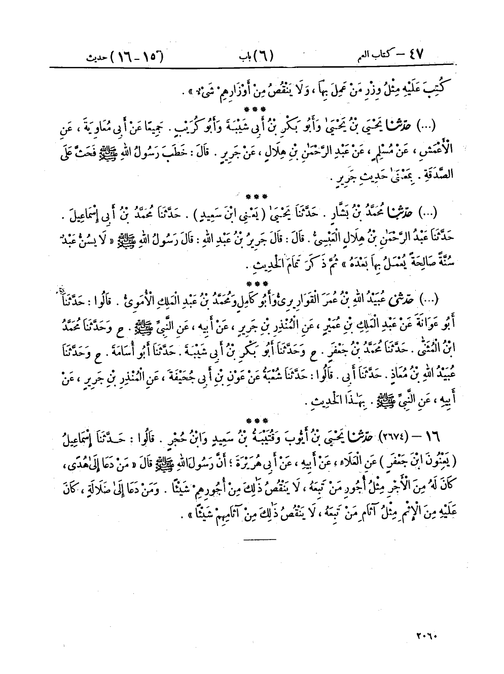١٦ - (٢٦٧٤) حَدَّثَنَا يَحْيَى بْنُ أَيُّوبَ، وَقُتَيْبَةُ بْنُ سَعِيدٍ، وَابْنُ حُجْرٍ، قَالُوا: حَدَّثَنَا إِسْمَاعِيلُ يَعْنُونَ ابْنَ جَعْفَرٍ، عَنِ الْعَلَاءِ، عَنْ أَبِيهِ، عَنْ أَبِي هُرَيْرَةَ، أَنَّ رَسُولَ اللهِ صَلَّى اللهُ عَلَيْهِ وَسَلَّمَ، قَالَ: «مَنْ دَعَا إِلَى هُدًى، كَانَ لَهُ مِنَ الْأَجْرِ مِثْلُ أُجُورِ مَنْ تَبِعَهُ، لَا يَنْقُصُ ذَلِكَ مِنْ أُجُورِهِمْ شَيْئًا، وَمَنْ دَعَا إِلَى ضَلَالَةٍ، كَانَ عَلَيْهِ مِنَ الْإِثْمِ مِثْلُ آثَامِ مَنْ تَبِعَهُ، لَا يَنْقُصُ ذَلِكَ مِنْ آثَامِهِمْ شَيْئًا»
