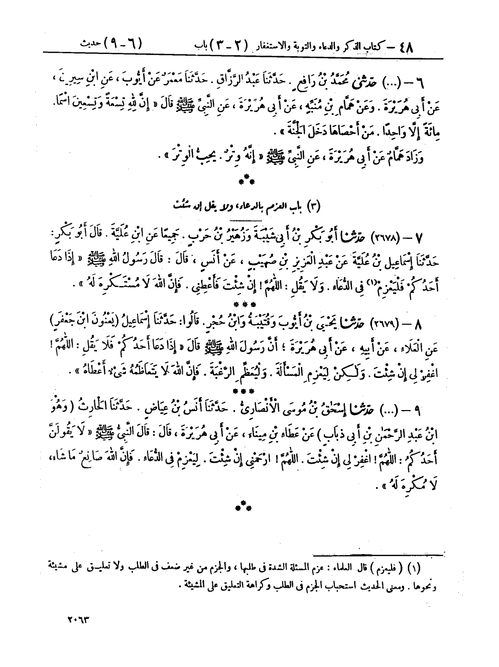 ٧ - (٢٦٧٨) حَدَّثَنَا أَبُو بَكْرِ بْنُ أَبِي شَيْبَةَ، وَزُهَيْرُ بْنُ حَرْبٍ، جَمِيعًا عَنِ ابْنِ عُلَيَّةَ، قَالَ أَبُو بَكْرٍ: حَدَّثَنَا إِسْمَاعِيلُ ابْنُ عُلَيَّةَ، عَنْ عَبْدِ الْعَزِيزِ بْنِ صُهَيْبٍ، عَنْ أَنَسٍ، قَالَ: قَالَ رَسُولُ اللهِ صَلَّى اللهُ عَلَيْهِ وَسَلَّمَ: " إِذَا دَعَا أَحَدُكُمْ فَلْيَعْزِمْ فِي الدُّعَاءِ، وَلَا يَقُلْ: اللهُمَّ إِنْ شِئْتَ فَأَعْطِنِي، فَإِنَّ اللهَ لَا مُسْتَكْرِهَ لَهُ "
