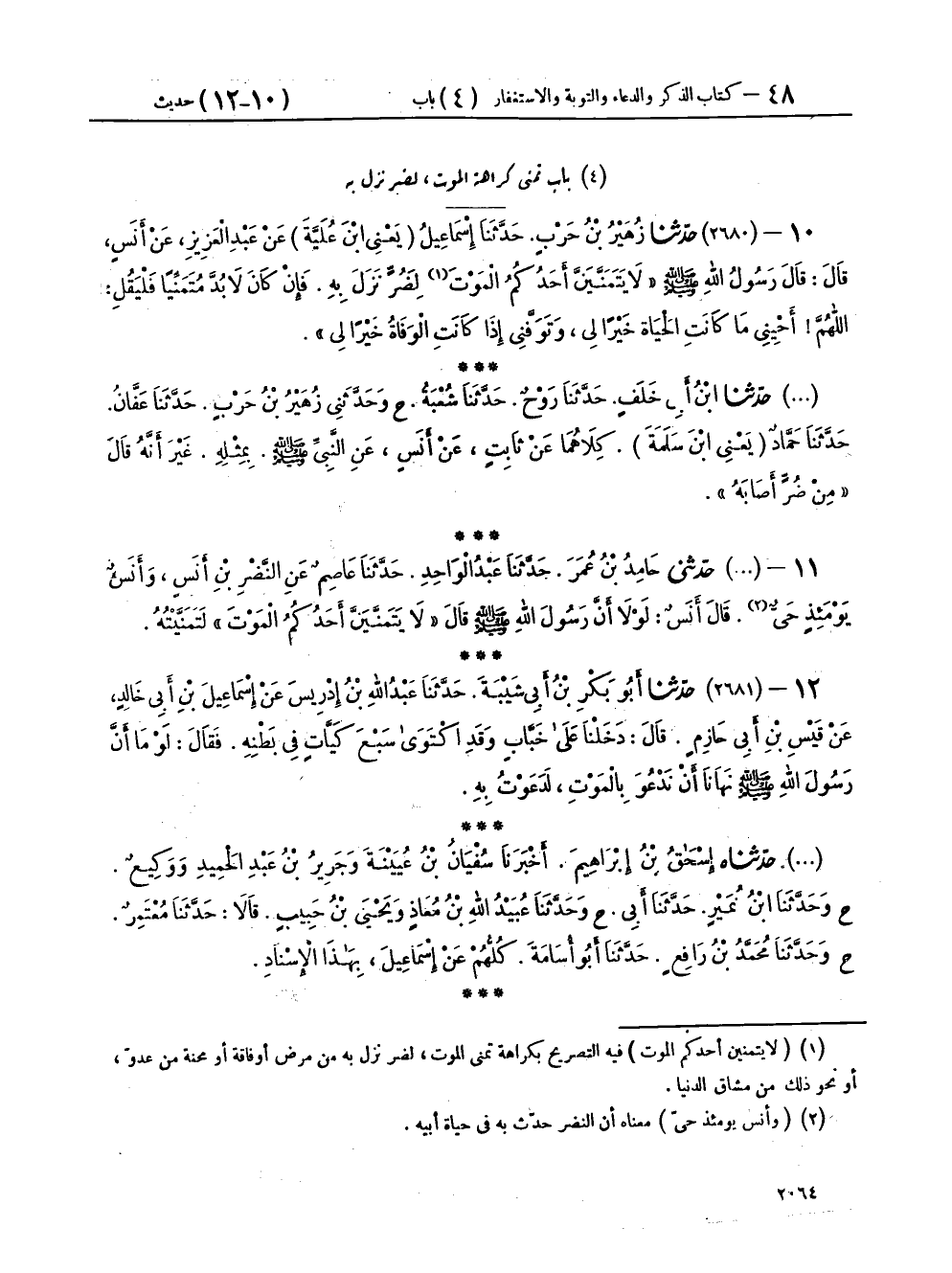 ١٢ - (٢٦٨١) حَدَّثَنَا أَبُو بَكْرِ بْنُ أَبِي شَيْبَةَ، حَدَّثَنَا عَبْدُ اللهِ بْنُ إِدْرِيسَ، عَنْ إِسْمَاعِيلَ بْنِ أَبِي خَالِدٍ، عَنْ قَيْسِ بْنِ أَبِي حَازِمٍ، قَالَ: دَخَلْنَا عَلَى خَبَّابٍ وَقَدِ اكْتَوَى سَبْعَ كَيَّاتٍ فِي بَطْنِهِ، فَقَالَ: لَوْ مَا أَنَّ رَسُولَ اللهِ صَلَّى اللهُ عَلَيْهِ وَسَلَّمَ «نَهَانَا أَنْ نَدْعُوَ بِالْمَوْتِ»، لَدَعَوْتُ بِهِ،