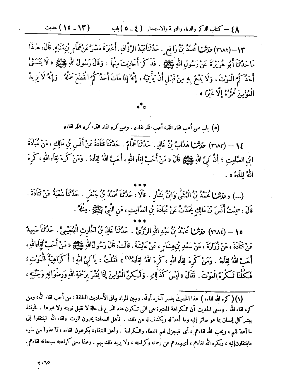 ١٤ - (٢٦٨٣) حَدَّثَنَا هَدَّابُ بْنُ خَالِدٍ، حَدَّثَنَا هَمَّامٌ، حَدَّثَنَا قَتَادَةُ، عَنْ أَنَسِ بْنِ مَالِكٍ، عَنْ عُبَادَةَ بْنِ الصَّامِتِ، أَنَّ نَبِيَّ اللهِ صَلَّى اللهُ عَلَيْهِ وَسَلَّمَ، قَالَ: «مَنْ أَحَبَّ لِقَاءَ اللهِ، أَحَبَّ اللهُ لِقَاءَهُ، وَمَنْ كَرِهَ لِقَاءَ اللهِ، كَرِهَ اللهُ لِقَاءَهُ»،