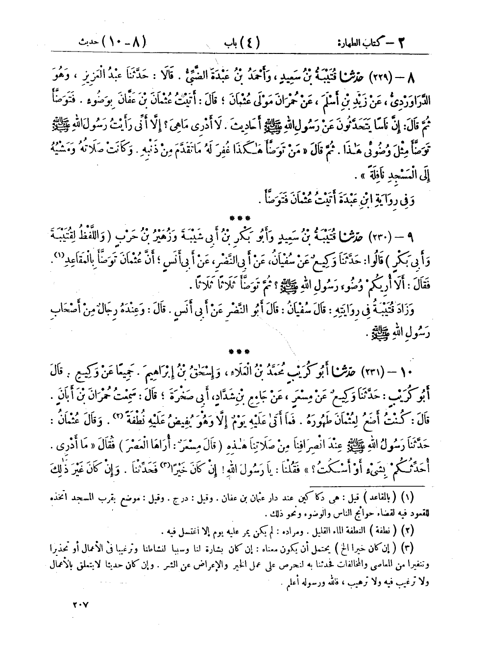 ٨ - (٢٢٩) حَدَّثَنَا قُتَيْبَةُ بْنُ سَعِيدٍ، وَأَحْمَدُ بْنُ عَبْدَةَ الضَّبِّيُّ، قَالَا: حَدَّثَنَا عَبْدُ الْعَزِيزِ وَهُوَ الدَّرَاوَرْدِيُّ، عَنْ زَيْدِ بْنِ أَسْلَمَ، عَنْ حُمْرَانَ، مَوْلَى عُثْمَانَ، قَالَ: أَتَيْتُ عُثْمَانَ بْنَ عَفَّانَ بِوَضُوءٍ فَتَوَضَّأَ، ثُمَّ قَالَ: إِنَّ نَاسًا يَتَحَدَّثُونَ عَنْ رَسُولِ اللهِ صَلَّى اللهُ عَلَيْهِ وَسَلَّمَ أَحَادِيثَ لَا أَدْرِي مَا هِيَ؟ إِلَّا أَنِّي رَأَيْتُ رَسُولَ اللهِ صَلَّى اللهُ عَلَيْهِ وَسَلَّمَ تَوَضَّأَ مِثْلَ وُضُوئِي هَذَا، ثُمَّ قَالَ: «مَنْ تَوَضَّأَ هَكَذَا غُفِرَ لَهُ مَا تَقَدَّمَ مِنْ ذَنْبِهِ، وَكَانَتْ صَلَاتُهُ وَمَشْيُهُ إِلَى الْمَسْجِدِ نَافِلَةً» وَفِي رِوَايَةِ ابْنِ عَبْدَةَ أَتَيْتُ عُثْمَانَ فَتَوَضَّأَ