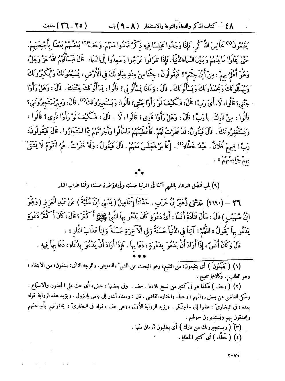 ٢٦ - (٢٦٩٠) حَدَّثَنِي زُهَيْرُ بْنُ حَرْبٍ، حَدَّثَنَا إِسْمَاعِيلُ يَعْنِي ابْنَ عُلَيَّةَ، عَنْ عَبْدِ الْعَزِيزِ وَهُوَ ابْنُ صُهَيْبٍ، قَالَ: سَأَلَ قَتَادَةُ أَنَسًا أَيُّ دَعْوَةٍ كَانَ يَدْعُو بِهَا النَّبِيُّ صَلَّى اللهُ عَلَيْهِ وَسَلَّمَ أَكْثَرَ، قَالَ: كَانَ أَكْثَرُ دَعْوَةٍ يَدْعُو بِهَا يَقُولُ: «اللهُمَّ آتِنَا فِي الدُّنْيَا حَسَنَةً وَفِي الْآخِرَةِ حَسَنَةً، وَقِنَا عَذَابَ النَّارِ» قَالَ: وَكَانَ أَنَسٌ إِذَا أَرَادَ أَنْ يَدْعُوَ بِدَعْوَةٍ دَعَا بِهَا، فَإِذَا أَرَادَ أَنْ يَدْعُوَ بِدُعَاءٍ دَعَا بِهَا فِيهِ