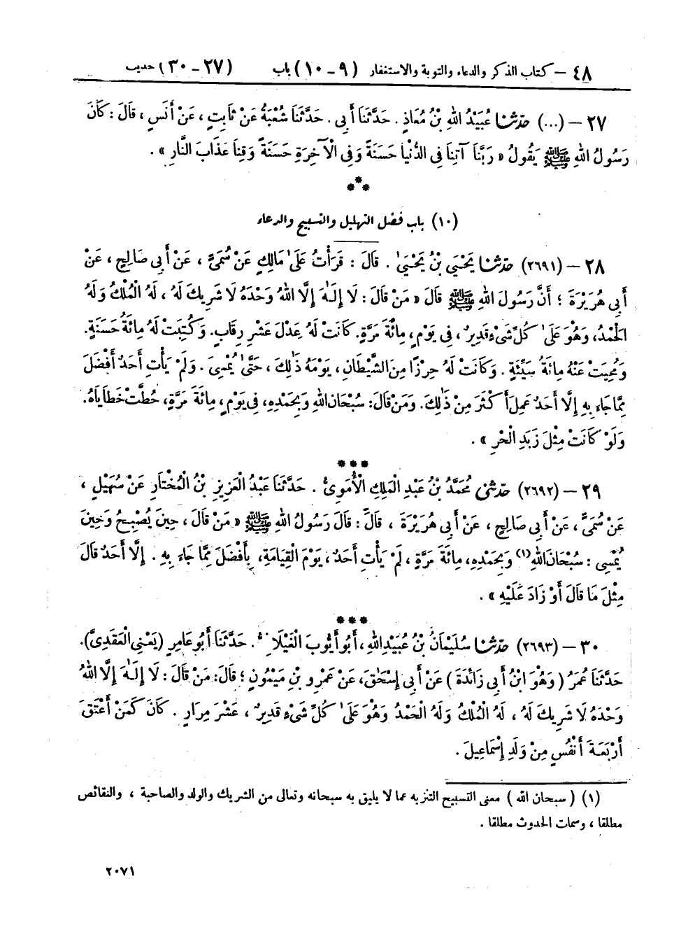 ٢٨ - (٢٦٩١) حَدَّثَنَا يَحْيَى بْنُ يَحْيَى، قَالَ: قَرَأْتُ عَلَى مَالِكٍ، عَنْ سُمَيٍّ، عَنْ أَبِي صَالِحٍ، عَنْ أَبِي هُرَيْرَةَ، أَنَّ رَسُولَ اللهِ صَلَّى اللهُ عَلَيْهِ وَسَلَّمَ، قَالَ: " مَنْ قَالَ: لَا إِلَهَ إِلَّا اللهُ وَحْدَهُ لَا شَرِيكَ لَهُ، لَهُ الْمُلْكُ وَلَهُ الْحَمْدُ وَهُوَ عَلَى كُلِّ شَيْءٍ قَدِيرٌ، فِي يَوْمٍ مِائَةَ مَرَّةٍ، كَانَتْ لَهُ عَدْلَ عَشْرِ رِقَابٍ، وَكُتِبَتْ لَهُ مِائَةُ حَسَنَةٍ وَمُحِيَتْ عَنْهُ مِائَةُ سَيِّئَةٍ، وَكَانَتْ لَهُ حِرْزًا مِنَ الشَّيْطَانِ، يَوْمَهُ ذَلِكَ، حَتَّى يُمْسِيَ وَلَمْ يَأْتِ أَحَدٌ أَفْضَلَ مِمَّا جَاءَ بِهِ إِلَّا أَحَدٌ عَمِلَ أَكْثَرَ مِنْ ذَلِكَ، وَمَنْ قَالَ: سُبْحَانَ اللهِ وَبِحَمْدِهِ، فِي يَوْمٍ مِائَةَ مَرَّةٍ حُطَّتْ خَطَايَاهُ وَلَوْ كَانَتْ مِثْلَ زَبَدِ الْبَحْرِ "