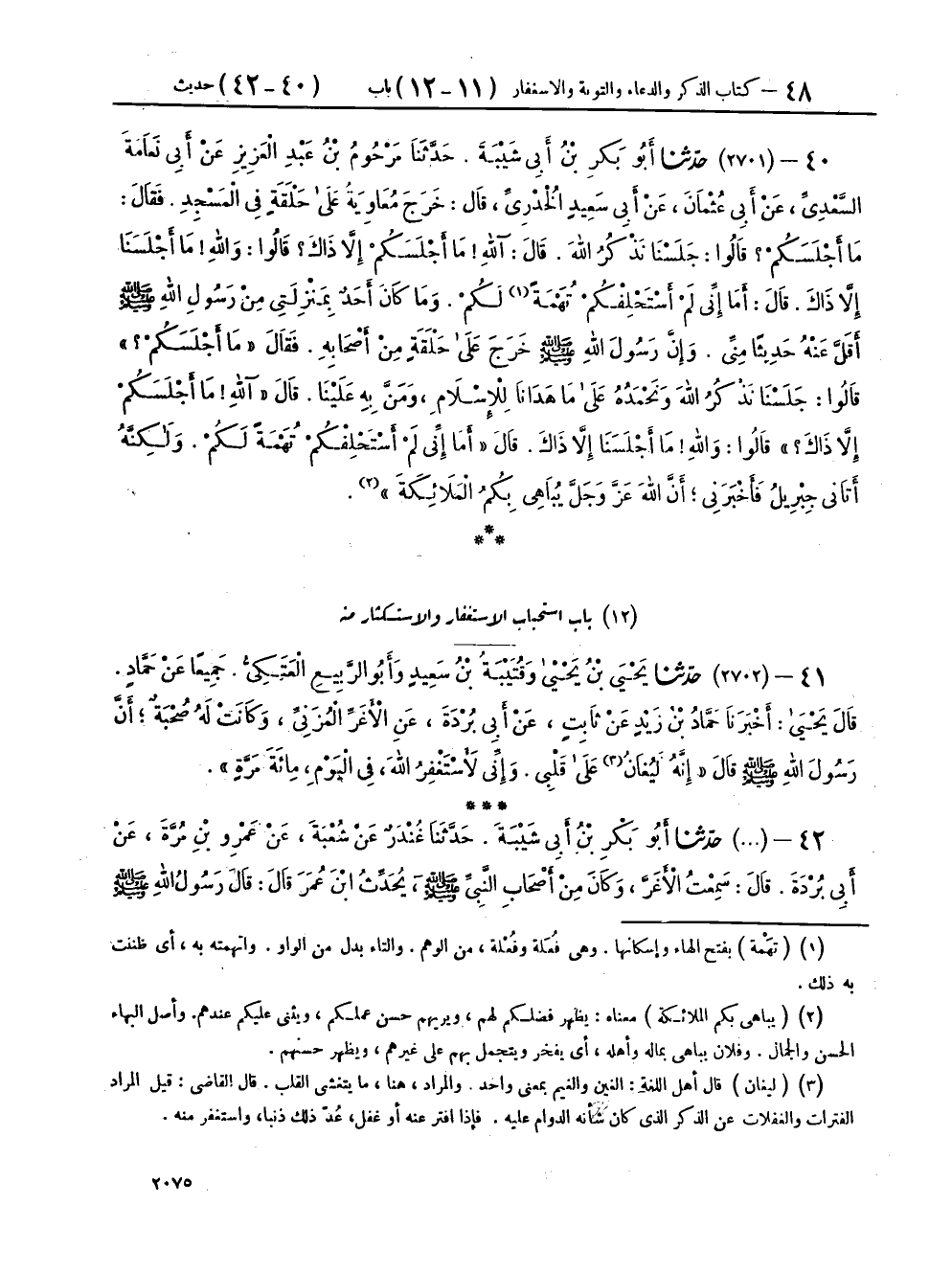 ٤٠ - (٢٧٠١) حَدَّثَنَا أَبُو بَكْرِ بْنُ أَبِي شَيْبَةَ، حَدَّثَنَا مَرْحُومُ بْنُ عَبْدِ الْعَزِيزِ، عَنْ أَبِي نَعَامَةَ السَّعْدِيِّ، عَنْ أَبِي عُثْمَانَ، عَنْ أَبِي سَعِيدٍ الْخُدْرِيِّ، قَالَ: خَرَجَ مُعَاوِيَةُ عَلَى حَلْقَةٍ فِي الْمَسْجِدِ، فَقَالَ: مَا أَجْلَسَكُمْ؟ قَالُوا: جَلَسْنَا نَذْكُرُ اللهَ، قَالَ آللَّهِ مَا أَجْلَسَكُمْ إِلَّا ذَاكَ؟ قَالُوا: وَاللهِ مَا أَجْلَسَنَا إِلَّا ذَاكَ، قَالَ: أَمَا إِنِّي لَمْ أَسْتَحْلِفْكُمْ تُهْمَةً لَكُمْ، وَمَا كَانَ أَحَدٌ بِمَنْزِلَتِي مِنْ رَسُولِ اللهِ صَلَّى اللهُ عَلَيْهِ وَسَلَّمَ أَقَلَّ عَنْهُ حَدِيثًا مِنِّي، وَإِنَّ رَسُولَ اللهِ صَلَّى اللهُ عَلَيْهِ وَسَلَّمَ خَرَجَ عَلَى حَلْقَةٍ مِنْ أَصْحَابِهِ، فَقَالَ: «مَا أَجْلَسَكُمْ؟» قَالُوا: جَلَسْنَا نَذْكُرُ اللهَ وَنَحْمَدُهُ عَلَى مَا هَدَانَا لِلْإِسْلَامِ، وَمَنَّ بِهِ عَلَيْنَا، قَالَ: «آللَّهِ مَا أَجْلَسَكُمْ إِلَّا ذَاكَ؟» قَالُوا: وَاللهِ مَا أَجْلَسَنَا إِلَّا ذَاكَ، قَالَ: «أَمَا إِنِّي لَمْ أَسْتَحْلِفْكُمْ تُهْمَةً لَكُمْ، وَلَكِنَّهُ أَتَانِي جِبْرِيلُ فَأَخْبَرَنِي، أَنَّ اللهَ عَزَّ وَجَلَّ يُبَاهِي بِكُمُ الْمَلَائِكَةَ»