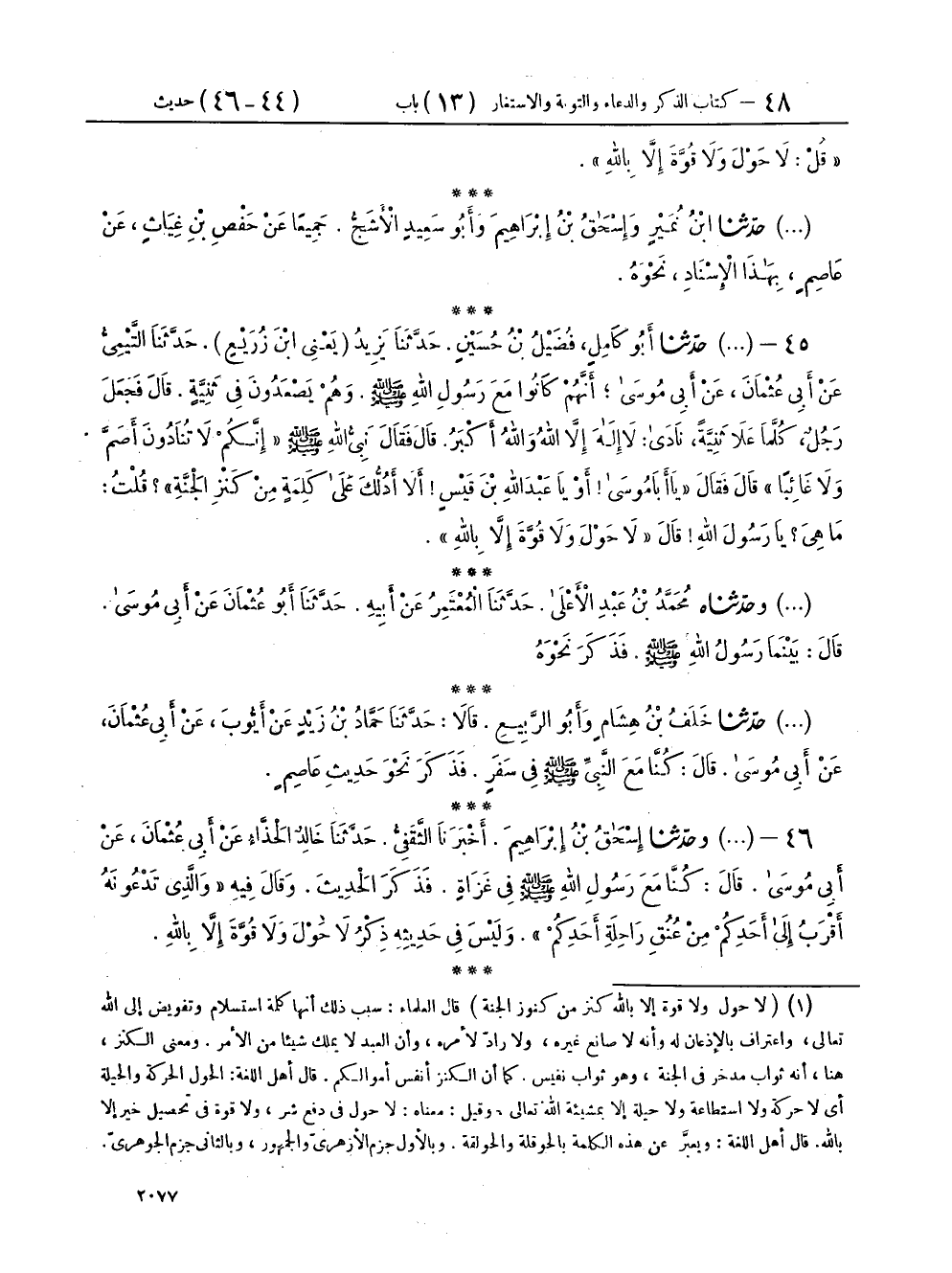 ٤٥ - (٢٧٠٤) حَدَّثَنَا أَبُو كَامِلٍ فُضَيْلُ بْنُ حُسَيْنٍ، حَدَّثَنَا يَزِيدُ يَعْنِي ابْنَ زُرَيْعٍ، حَدَّثَنَا التَّيْمِيُّ، عَنْ أَبِي عُثْمَانَ، عَنْ أَبِي مُوسَى، أَنَّهُمْ كَانُوا مَعَ رَسُولِ اللهِ صَلَّى اللهُ عَلَيْهِ وَسَلَّمَ، وَهُمْ يَصْعَدُونَ فِي ثَنِيَّةٍ، قَالَ: فَجَعَلَ رَجُلٌ، كُلَّمَا عَلَا ثَنِيَّةً، نَادَى لَا إِلَهَ إِلَّا اللهُ، وَاللهُ أَكْبَرُ، قَالَ: فَقَالَ نَبِيُّ اللهِ صَلَّى اللهُ عَلَيْهِ وَسَلَّمَ: «إِنَّكُمْ لَا تُنَادُونَ أَصَمَّ، وَلَا غَائِبًا» قَالَ: فَقَالَ: «يَا أَبَا مُوسَى أَوْ يَا عَبْدَ اللهِ بْنَ قَيْسٍ أَلَا أَدُلُّكَ عَلَى كَلِمَةٍ مِنْ كَنْزِ الْجَنَّةِ» قُلْتُ: مَا هِيَ؟ يَا رَسُولَ اللهِ قَالَ: «لَا حَوْلَ وَلَا قُوَّةَ إِلَّا بِاللهِ»،