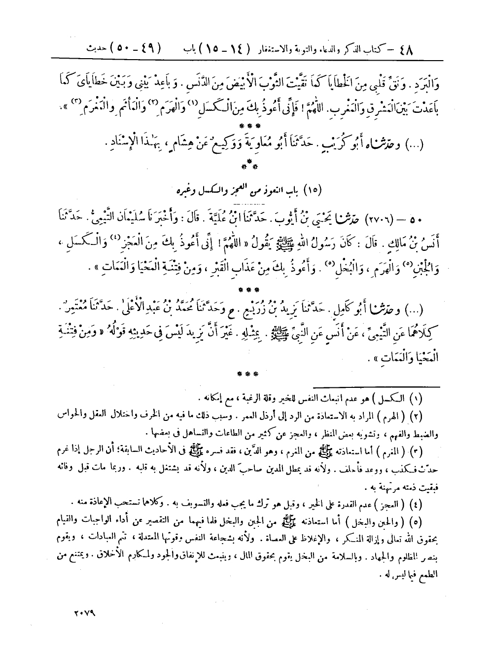 ٥٠ - (٢٧٠٦) حَدَّثَنَا يَحْيَى بْنُ أَيُّوبَ، حَدَّثَنَا ابْنُ عُلَيَّةَ، قَالَ: وَأَخْبَرَنَا سُلَيْمَانُ التَّيْمِيُّ، حَدَّثَنَا أَنَسُ بْنُ مَالِكٍ، قَالَ: كَانَ رَسُولُ اللهِ صَلَّى اللهُ عَلَيْهِ وَسَلَّمَ، يَقُولُ: «اللهُمَّ إِنِّي أَعُوذُ بِكَ مِنَ الْعَجْزِ، وَالْكَسَلِ، وَالْجُبْنِ، وَالْهَرَمِ، وَالْبُخْلِ، وَأَعُوذُ بِكَ مِنْ عَذَابِ الْقَبْرِ، وَمِنْ فِتْنَةِ الْمَحْيَا وَالْمَمَاتِ»،
