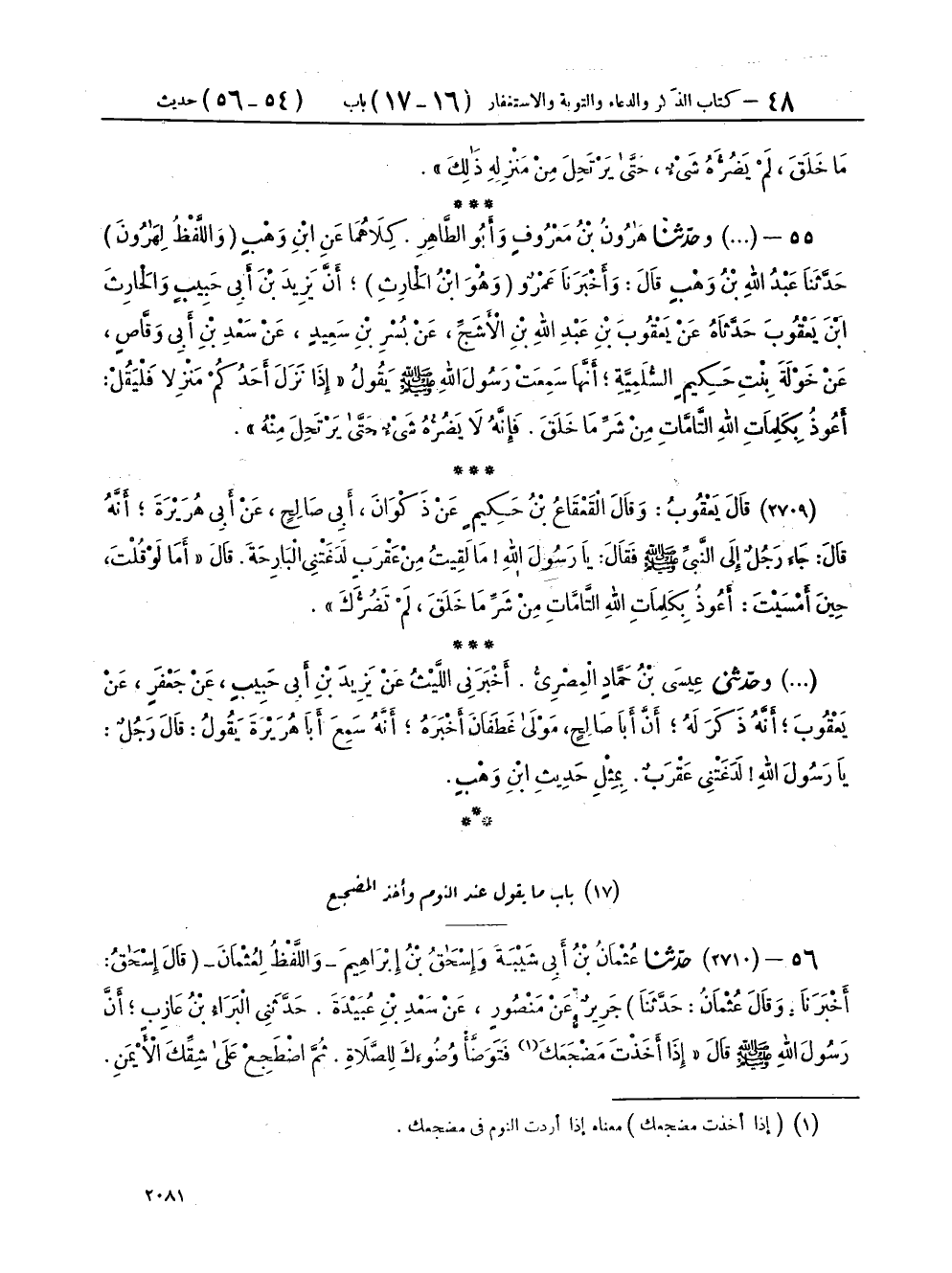 ٥٦ - (٢٧١٠) حَدَّثَنَا عُثْمَانُ بْنُ أَبِي شَيْبَةَ، وَإِسْحَاقُ بْنُ إِبْرَاهِيمَ - وَاللَّفْظُ لِعُثْمَانَ، قَالَ إِسْحَاقُ: أَخْبَرَنَا، وقَالَ عُثْمَانُ: حَدَّثَنَا - جَرِيرٌ، عَنْ مَنْصُورٍ، عَنْ سَعْدِ بْنِ عُبَيْدَةَ، حَدَّثَنِي الْبَرَاءُ بْنُ عَازِبٍ، أَنَّ رَسُولَ اللهِ صَلَّى اللهُ عَلَيْهِ وَسَلَّمَ، قَالَ: " إِذَا أَخَذْتَ مَضْجَعَكَ، فَتَوَضَّأْ وُضُوءَكَ لِلصَّلَاةِ، ثُمَّ اضْطَجِعْ عَلَى شِقِّكَ الْأَيْمَنِ، ثُمَّ قُلْ: اللهُمَّ إِنِّي أَسْلَمْتُ وَجْهِي إِلَيْكَ، وَفَوَّضْتُ أَمْرِي إِلَيْكَ، وَأَلْجَأْتُ ظَهْرِي إِلَيْكَ رَغْبَةً وَرَهْبَةً إِلَيْكَ، لَا مَلْجَأَ وَلَا مَنْجَا مِنْكَ إِلَّا إِلَيْكَ، آمَنْتُ بِكِتَابِكَ الَّذِي أَنْزَلْتَ، وَبِنَبِيِّكَ الَّذِي أَرْسَلْتَ، وَاجْعَلْهُنَّ مِنْ آخِرِ كَلَامِكَ، فَإِنْ مُتَّ مِنْ لَيْلَتِكَ، مُتَّ وَأَنْتَ عَلَى الْفِطْرَةِ قَالَ: فَرَدَّدْتُهُنَّ لِأَسْتَذْكِرَهُنَّ فَقُلْتُ: آمَنْتُ بِرَسُولِكَ الَّذِي أَرْسَلْتَ، قَالَ: " قُلْ: آمَنْتُ بِنَبِيِّكَ الَّذِي أَرْسَلْتَ "
