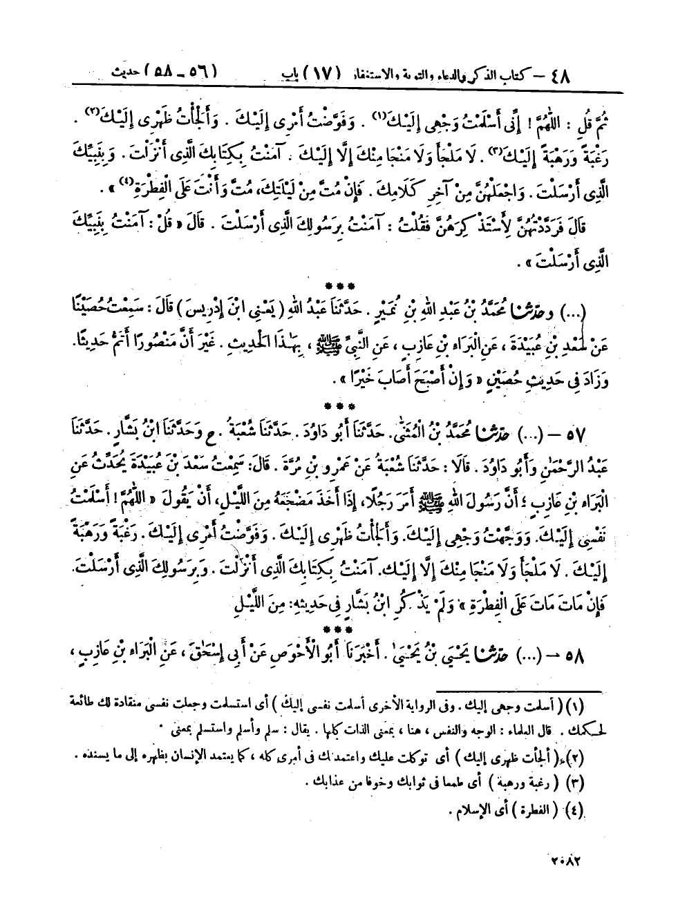 ٥٧ - (٢٧١٠) حَدَّثَنَا مُحَمَّدُ بْنُ الْمُثَنَّى، حَدَّثَنَا أَبُو دَاوُدَ، حَدَّثَنَا شُعْبَةُ، ح وَحَدَّثَنَا ابْنُ بَشَّارٍ، حَدَّثَنَا عَبْدُ الرَّحْمَنِ، وَأَبُو دَاوُدَ، قَالَا: حَدَّثَنَا شُعْبَةُ، عَنْ عَمْرِو بْنِ مُرَّةَ، قَالَ: سَمِعْتُ سَعْدَ بْنَ عُبَيْدَةَ، يُحَدِّثُ عَنِ الْبَرَاءِ بْنِ عَازِبٍ، أَنَّ رَسُولَ اللهِ صَلَّى اللهُ عَلَيْهِ وَسَلَّمَ، أَمَرَ رَجُلًا إِذَا أَخَذَ مَضْجَعَهُ مِنَ اللَّيْلِ أَنْ يَقُولَ: «اللهُمَّ أَسْلَمْتُ نَفْسِي إِلَيْكَ، وَوَجَّهْتُ وَجْهِي إِلَيْكَ، وَأَلْجَأْتُ ظَهْرِي إِلَيْكَ، وَفَوَّضْتُ أَمْرِي إِلَيْكَ، رَغْبَةً وَرَهْبَةً إِلَيْكَ، لَا مَلْجَأَ وَلَا مَنْجَا مِنْكَ إِلَّا إِلَيْكَ، آمَنْتُ بِكِتَابِكَ الَّذِي أَنْزَلْتَ، وَبِرَسُولِكَ الَّذِي أَرْسَلْتَ، فَإِنْ مَاتَ مَاتَ عَلَى الْفِطْرَةِ» وَلَمْ يَذْكُرِ ابْنُ بَشَّارٍ فِي حَدِيثِهِ: مِنَ اللَّيْلِ،