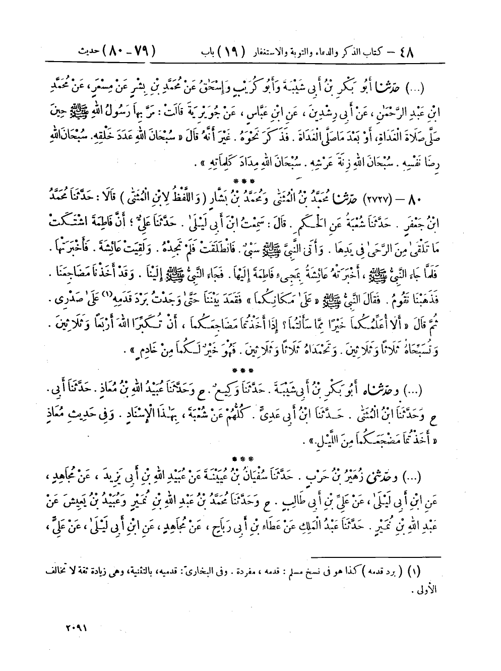 ٨٠ - (٢٧٢٧) حَدَّثَنَا مُحَمَّدُ بْنُ الْمُثَنَّى، وَمُحَمَّدُ بْنُ بَشَّارٍ - وَاللَّفْظُ لِابْنِ الْمُثَنَّى - قَالَا: حَدَّثَنَا مُحَمَّدُ بْنُ جَعْفَرٍ، حَدَّثَنَا شُعْبَةُ، عَنِ الْحَكَمِ، قَالَ: سَمِعْتُ ابْنَ أَبِي لَيْلَى، حَدَّثَنَا عَلِيٌّ، أَنَّ فَاطِمَةَ، اشْتَكَتْ مَا تَلْقَى مِنَ الرَّحَى فِي يَدِهَا، وَأَتَى النَّبِيَّ صَلَّى اللهُ عَلَيْهِ وَسَلَّمَ سَبْيٌ، فَانْطَلَقَتْ، فَلَمْ تَجِدْهُ وَلَقِيَتْ عَائِشَةَ، فَأَخْبَرَتْهَا فَلَمَّا جَاءَ النَّبِيُّ صَلَّى اللهُ عَلَيْهِ وَسَلَّمَ، أَخْبَرَتْهُ عَائِشَةُ بِمَجِيءِ فَاطِمَةَ إِلَيْهَا، فَجَاءَ النَّبِيُّ صَلَّى اللهُ عَلَيْهِ وَسَلَّمَ إِلَيْنَا، وَقَدْ أَخَذْنَا مَضَاجِعَنَا، فَذَهَبْنَا نَقُومُ فَقَالَ النَّبِيُّ صَلَّى اللهُ عَلَيْهِ وَسَلَّمَ: «عَلَى مَكَانِكُمَا» فَقَعَدَ بَيْنَنَا حَتَّى وَجَدْتُ بَرْدَ قَدَمِهِ عَلَى صَدْرِي، ثُمَّ قَالَ: «أَلَا أُعَلِّمُكُمَا خَيْرًا مِمَّا سَأَلْتُمَا، إِذَا أَخَذْتُمَا مَضَاجِعَكُمَا، أَنْ تُكَبِّرَا اللهَ أَرْبَعًا وَثَلَاثِينَ، وَتُسَبِّحَاهُ ثَلَاثًا وَثَلَاثِينَ، وَتَحْمَدَاهُ ثَلَاثًا وَثَلَاثِينَ، فَهْوَ خَيْرٌ لَكُمَا مِنْ خَادِمٍ»،