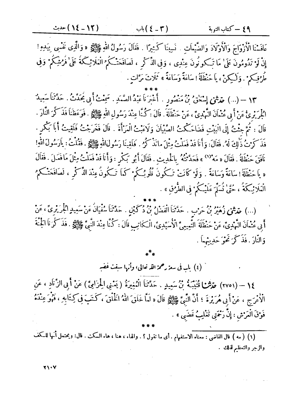 ١٣ - (٢٧٥٠) حَدَّثَنِي إِسْحَاقُ بْنُ مَنْصُورٍ، أَخْبَرَنَا عَبْدُ الصَّمَدِ، سَمِعْتُ أَبِي يُحَدِّثُ، حَدَّثَنَا سَعِيدٌ الْجُرَيْرِيُّ، عَنْ أَبِي عُثْمَانَ النَّهْدِيِّ، عَنْ حَنْظَلَةَ، قَالَ: كُنَّا عِنْدَ رَسُولِ اللهِ صَلَّى اللهُ عَلَيْهِ وَسَلَّمَ، فَوَعَظَنَا، فَذَكَّرَ النَّارَ، قَالَ: ثُمَّ جِئْتُ إِلَى الْبَيْتِ فَضَاحَكْتُ الصِّبْيَانَ وَلَاعَبْتُ الْمَرْأَةَ، قَالَ: فَخَرَجْتُ فَلَقِيتُ أَبَا بَكْرٍ فَذَكَرْتُ ذَلِكَ لَهُ، فَقَالَ: وَأَنَا قَدْ فَعَلْتُ مِثْلَ مَا تَذْكُرُ، فَلَقِينَا رَسُولَ اللهِ صَلَّى اللهُ عَلَيْهِ وَسَلَّمَ، فَقُلْتُ: يَا رَسُولَ اللهِ نَافَقَ حَنْظَلَةُ فَقَالَ: «مَهْ» فَحَدَّثْتُهُ بِالْحَدِيثِ، فَقَالَ أَبُو بَكْرٍ: وَأَنَا قَدْ فَعَلْتُ مِثْلَ مَا فَعَلَ، فَقَالَ: «يَا حَنْظَلَةُ سَاعَةً وَسَاعَةً، وَلَوْ كَانَتْ تَكُونُ قُلُوبُكُمْ كَمَا تَكُونُ عِنْدَ الذِّكْرِ، لَصَافَحَتْكُمُ الْمَلَائِكَةُ، حَتَّى تُسَلِّمَ عَلَيْكُمْ فِي الطُّرُقِ»،