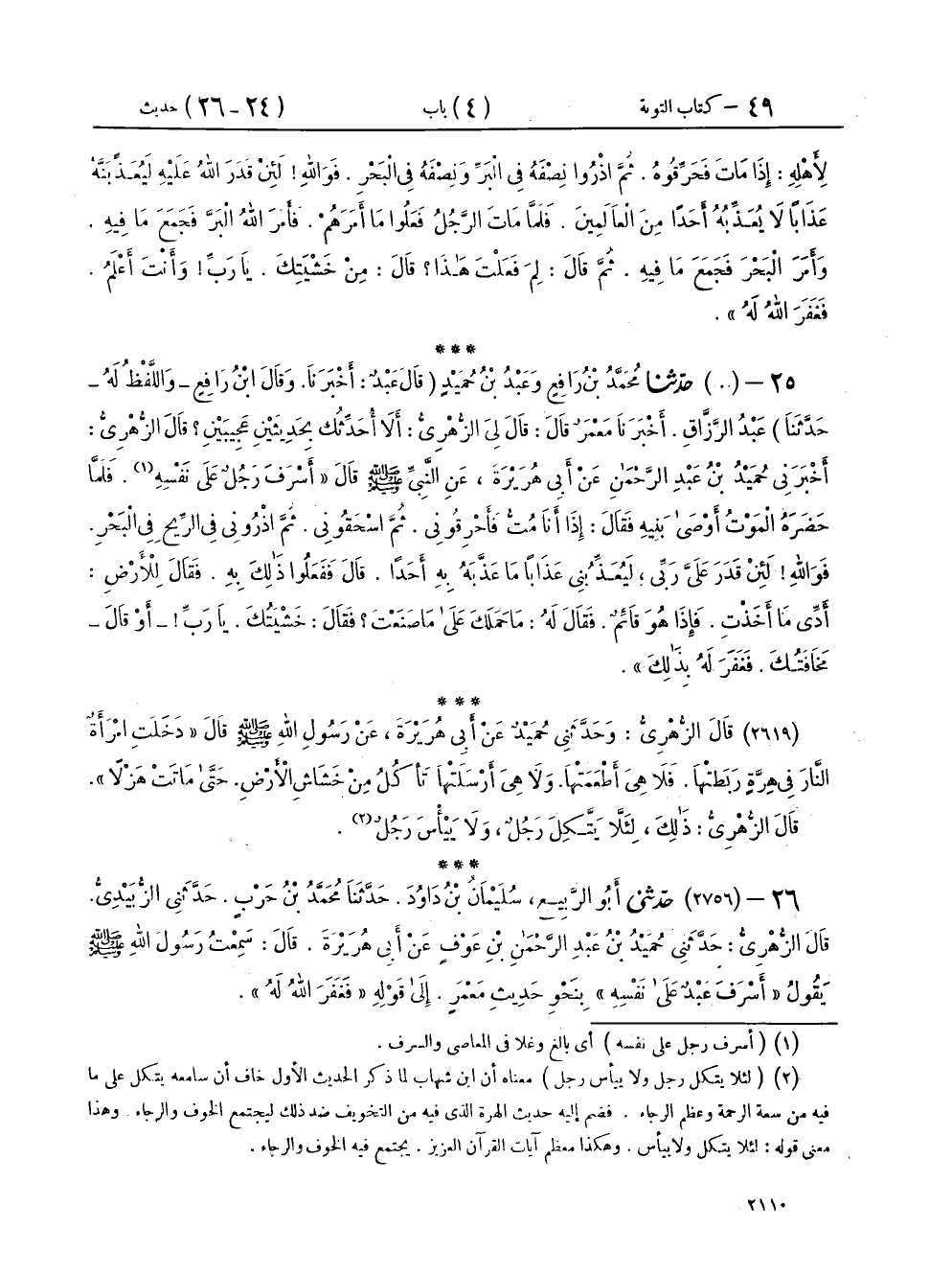 ٢٥ - (٢٧٥٦) حَدَّثَنَا مُحَمَّدُ بْنُ رَافِعٍ، وَعَبْدُ بْنُ حُمَيْدٍ - قَالَ عَبْدٌ: أَخْبَرَنَا، وقَالَ ابْنُ رَافِعٍ وَاللَّفْظُ لَهُ حَدَّثَنَا - عَبْدُ الرَّزَّاقِ، أَخْبَرَنَا مَعْمَرٌ، قَالَ: قَالَ لِي الزُّهْرِيُّ: أَلَا أُحَدِّثُكَ بِحَدِيثَيْنِ عَجِيبَيْنِ؟ قَالَ الزُّهْرِيُّ: أَخْبَرَنِي حُمَيْدُ بْنُ عَبْدِ الرَّحْمَنِ، عَنْ أَبِي هُرَيْرَةَ، عَنِ النَّبِيِّ صَلَّى اللهُ عَلَيْهِ وَسَلَّمَ، قَالَ: " أَسْرَفَ رَجُلٌ عَلَى نَفْسِهِ، فَلَمَّا حَضَرَهُ الْمَوْتُ أَوْصَى بَنِيهِ فَقَالَ: إِذَا أَنَا مُتُّ فَأَحْرِقُونِي، ثُمَّ اسْحَقُونِي، ثُمَّ اذْرُونِي فِي الرِّيحِ فِي الْبَحْرِ، فَوَاللهِ لَئِنْ قَدَرَ عَلَيَّ رَبِّي لَيُعَذِّبُنِي عَذَابًا مَا عَذَّبَهُ بِهِ أَحَدًا، قَالَ فَفَعَلُوا ذَلِكَ بِهِ، فَقَالَ لِلْأَرْضِ: أَدِّي مَا أَخَذْتِ، فَإِذَا هُوَ قَائِمٌ، فَقَالَ لَهُ: مَا حَمَلَكَ عَلَى مَا صَنَعْتَ؟ فَقَالَ: خَشْيَتُكَ، يَا رَبِّ - أَوْ قَالَ مَخَافَتُكَ - فَغَفَرَ لَهُ بِذَلِكَ "