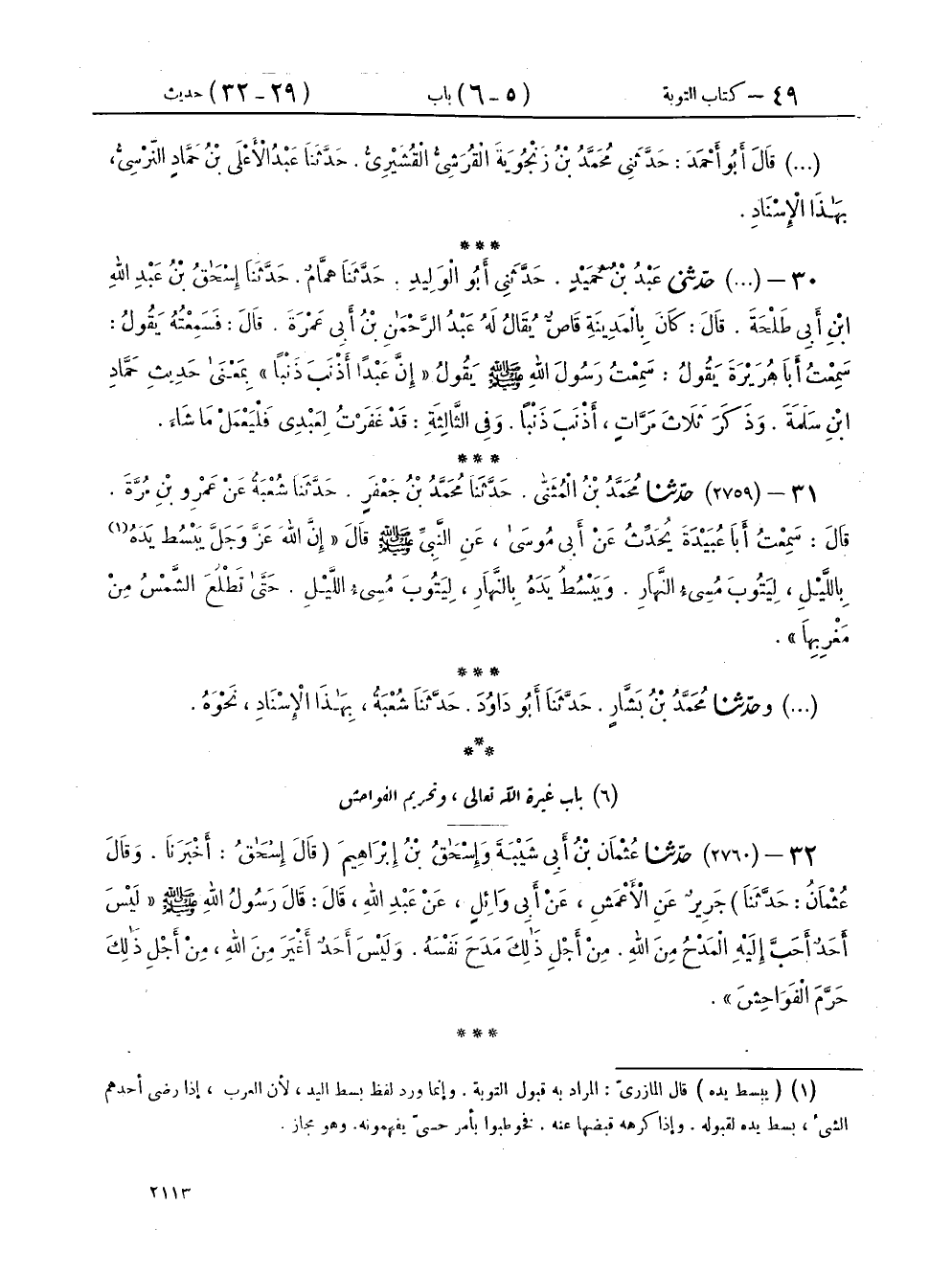 ٣١ - (٢٧٥٩) حَدَّثَنَا مُحَمَّدُ بْنُ الْمُثَنَّى، حَدَّثَنَا مُحَمَّدُ بْنُ جَعْفَرٍ، حَدَّثَنَا شُعْبَةُ، عَنْ عَمْرِو بْنِ مُرَّةَ، قَالَ: سَمِعْتُ أَبَا عُبَيْدَةَ، يُحَدِّثُ عَنْ أَبِي مُوسَى، عَنِ النَّبِيِّ صَلَّى اللهُ عَلَيْهِ وَسَلَّمَ، قَالَ: «إِنَّ اللهَ عَزَّ وَجَلَّ يَبْسُطُ يَدَهُ بِاللَّيْلِ لِيَتُوبَ مُسِيءُ النَّهَارِ، وَيَبْسُطُ يَدَهُ بِالنَّهَارِ لِيَتُوبَ مُسِيءُ اللَّيْلِ، حَتَّى تَطْلُعَ الشَّمْسُ مِنْ مَغْرِبِهَا»