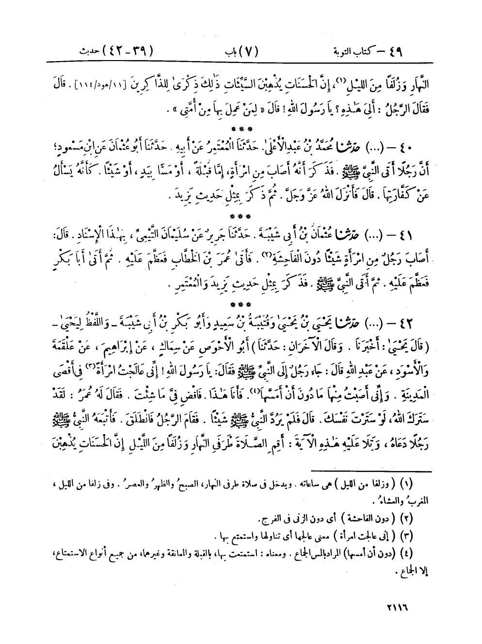 ٤٢ - (٢٧٦٣) حَدَّثَنَا يَحْيَى بْنُ يَحْيَى، وَقُتَيْبَةُ بْنُ سَعِيدٍ، وَأَبُو بَكْرِ بْنُ أَبِي شَيْبَةَ - وَاللَّفْظُ لِيَحْيَى، قَالَ يَحْيَى: أَخْبَرَنَا وقَالَ الْآخَرَانِ: حَدَّثَنَا - أَبُو الْأَحْوَصِ، عَنْ سِمَاكٍ، عَنْ إِبْرَاهِيمَ، عَنْ عَلْقَمَةَ، وَالْأَسْوَدِ، عَنْ عَبْدِ اللهِ، قَالَ: جَاءَ رَجُلٌ إِلَى النَّبِيِّ صَلَّى اللهُ عَلَيْهِ وَسَلَّمَ، فَقَالَ: يَا رَسُولَ اللهِ إِنِّي عَالَجْتُ امْرَأَةً فِي أَقْصَى الْمَدِينَةِ، وَإِنِّي أَصَبْتُ مِنْهَا مَا دُونَ أَنْ أَمَسَّهَا، فَأَنَا هَذَا، فَاقْضِ فِيَّ مَا شِئْتَ، فَقَالَ لَهُ عُمَرُ: لَقَدْ سَتَرَكَ اللهُ، لَوْ سَتَرْتَ نَفْسَكَ، قَالَ: فَلَمْ يَرُدَّ النَّبِيُّ صَلَّى اللهُ عَلَيْهِ وَسَلَّمَ شَيْئًا، فَقَامَ الرَّجُلُ فَانْطَلَقَ، فَأَتْبَعَهُ النَّبِيُّ صَلَّى اللهُ عَلَيْهِ وَسَلَّمَ رَجُلًا دَعَاهُ، وَتَلَا عَلَيْهِ هَذِهِ الْآيَةَ: {أَقِمِ الصَّلَاةَ طَرَفَيِ النَّهَارِ وَزُلَفًا مِنَ اللَّيْلِ، إِنَّ الْحَسَنَاتِ يُذْهِبْنَ السَّيِّئَاتِ ذَلِكَ ذِكْرَى لِلذَّاكِرِينَ} [هود: ١١٤] فَقَالَ رَجُلٌ مِنَ الْقَوْمِ: يَا نَبِيَّ اللهِ هَذَا لَهُ خَاصَّةً؟ قَالَ: «بَلْ لِلنَّاسِ كَافَّةً»