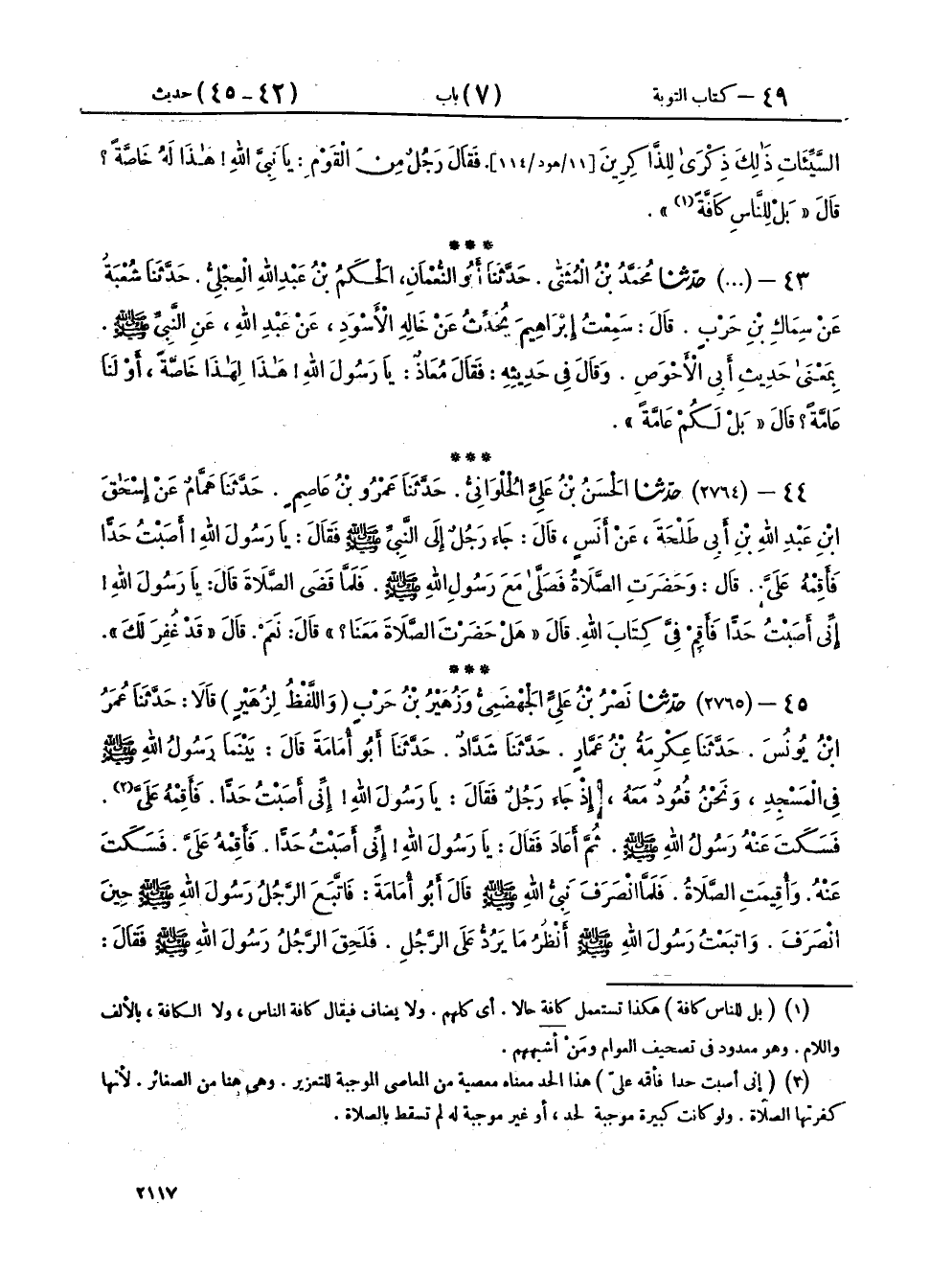 ٤٥ - (٢٧٦٥) حَدَّثَنَا نَصْرُ بْنُ عَلِيٍّ الْجَهْضَمِيُّ، وَزُهَيْرُ بْنُ حَرْبٍ - وَاللَّفْظُ لِزُهَيْرٍ - قَالَا: حَدَّثَنَا عُمَرُ بْنُ يُونُسَ، حَدَّثَنَا عِكْرِمَةُ بْنُ عَمَّارٍ، حَدَّثَنَا شَدَّادٌ، حَدَّثَنَا أَبُو أُمَامَةَ، قَالَ: بَيْنَمَا رَسُولُ اللهِ صَلَّى اللهُ عَلَيْهِ وَسَلَّمَ فِي الْمَسْجِدِ، وَنَحْنُ قُعُودٌ مَعَهُ، إِذْ جَاءَ رَجُلٌ فَقَالَ: يَا رَسُولَ اللهِ إِنِّي أَصَبْتُ حَدًّا، فَأَقِمْهُ عَلَيَّ، فَسَكَتَ عَنْهُ رَسُولُ اللهِ صَلَّى اللهُ عَلَيْهِ وَسَلَّمَ، ثُمَّ أَعَادَ فَقَالَ: يَا رَسُولَ اللهِ إِنِّي أَصَبْتُ حَدًّا، فَأَقِمْهُ عَلَيَّ، فَسَكَتَ عَنْهُ، وَأُقِيمَتِ الصَّلَاةُ، فَلَمَّا انْصَرَفَ نَبِيُّ اللهِ صَلَّى اللهُ عَلَيْهِ وَسَلَّمَ قَالَ: أَبُو أُمَامَةَ: فَاتَّبَعَ الرَّجُلُ رَسُولَ اللهِ صَلَّى اللهُ عَلَيْهِ وَسَلَّمَ حِينَ انْصَرَفَ، وَاتَّبَعْتُ رَسُولَ اللهِ صَلَّى اللهُ عَلَيْهِ وَسَلَّمَ أَنْظُرُ مَا يَرُدُّ عَلَى الرَّجُلِ، فَلَحِقَ الرَّجُلُ رَسُولَ اللهِ صَلَّى اللهُ عَلَيْهِ وَسَلَّمَ، فَقَالَ: يَا رَسُولَ اللهِ إِنِّي أَصَبْتُ حَدًّا، فَأَقِمْهُ عَلَيَّ، قَالَ أَبُو أُمَامَةَ: فَقَالَ لَهُ رَسُولُ اللهِ صَلَّى اللهُ عَلَيْهِ وَسَلَّمَ: «أَرَأَيْتَ حِينَ خَرَجْتَ مِنْ بَيْتِكَ، أَلَيْسَ قَدْ تَوَضَّأْتَ فَأَحْسَنْتَ الْوُضُوءَ؟» قَالَ: بَلَى، يَا رَسُولَ اللهِ قَالَ: «ثُمَّ شَهِدْتَ الصَّلَاةَ مَعَنَا» فَقَالَ: نَعَمْ، يَا رَسُولَ اللهِ قَالَ: فَقَالَ لَهُ رَسُولُ اللهِ صَلَّى اللهُ عَلَيْهِ وَسَلَّمَ: " فَإِنَّ اللهَ قَدْ غَفَرَ لَكَ حَدَّكَ - أَوْ قَالَ: ذَنْبَكَ - "