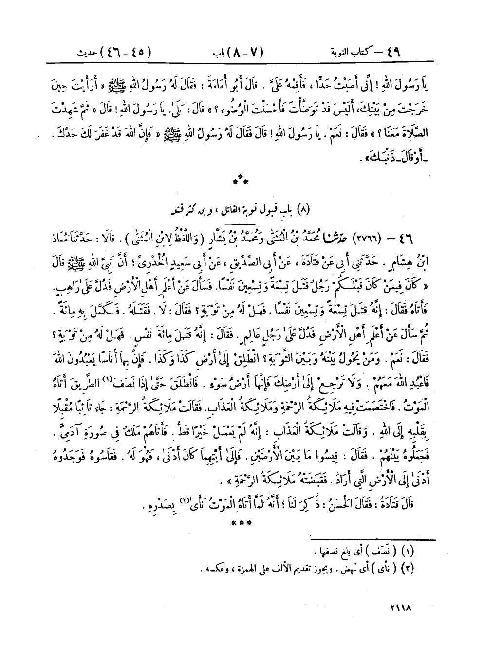 ٤٦ - (٢٧٦٦) حَدَّثَنَا مُحَمَّدُ بْنُ الْمُثَنَّى، وَمُحَمَّدُ بْنُ بَشَّارٍ - وَاللَّفْظُ لِابْنِ الْمُثَنَّى - قَالَا: حَدَّثَنَا مُعَاذُ بْنُ هِشَامٍ، حَدَّثَنِي أَبِي، عَنْ قَتَادَةَ، عَنْ أَبِي الصِّدِّيقِ، عَنْ أَبِي سَعِيدٍ الْخُدْرِيِّ، أَنَّ نَبِيَّ اللهِ صَلَّى اللهُ عَلَيْهِ وَسَلَّمَ قَالَ: " كَانَ فِيمَنْ كَانَ قَبْلَكُمْ رَجُلٌ قَتَلَ تِسْعَةً وَتِسْعِينَ نَفْسًا، فَسَأَلَ عَنْ أَعْلَمِ أَهْلِ الْأَرْضِ فَدُلَّ عَلَى رَاهِبٍ، فَأَتَاهُ فَقَالَ: إِنَّهُ قَتَلَ تِسْعَةً وَتِسْعِينَ نَفْسًا، فَهَلْ لَهُ مِنْ تَوْبَةٍ؟ فَقَالَ: لَا، فَقَتَلَهُ، فَكَمَّلَ بِهِ مِائَةً، ثُمَّ سَأَلَ عَنْ أَعْلَمِ أَهْلِ الْأَرْضِ فَدُلَّ عَلَى رَجُلٍ عَالِمٍ، فَقَالَ: إِنَّهُ قَتَلَ مِائَةَ نَفْسٍ، فَهَلْ لَهُ مِنْ تَوْبَةٍ؟ فَقَالَ: نَعَمْ، وَمَنْ يَحُولُ بَيْنَهُ وَبَيْنَ التَّوْبَةِ؟ انْطَلِقْ إِلَى أَرْضِ كَذَا وَكَذَا، فَإِنَّ بِهَا أُنَاسًا يَعْبُدُونَ اللهَ فَاعْبُدِ اللهَ مَعَهُمْ، وَلَا تَرْجِعْ إِلَى أَرْضِكَ، فَإِنَّهَا أَرْضُ سَوْءٍ، فَانْطَلَقَ حَتَّى إِذَا نَصَفَ الطَّرِيقَ أَتَاهُ الْمَوْتُ، فَاخْتَصَمَتْ فِيهِ مَلَائِكَةُ الرَّحْمَةِ وَمَلَائِكَةُ الْعَذَابِ، فَقَالَتْ مَلَائِكَةُ الرَّحْمَةِ: جَاءَ تَائِبًا مُقْبِلًا بِقَلْبِهِ إِلَى اللهِ، وَقَالَتْ مَلَائِكَةُ الْعَذَابِ: إِنَّهُ لَمْ يَعْمَلْ خَيْرًا قَطُّ، فَأَتَاهُمْ مَلَكٌ فِي صُورَةِ آدَمِيٍّ، فَجَعَلُوهُ بَيْنَهُمْ، فَقَالَ: قِيسُوا مَا بَيْنَ الْأَرْضَيْنِ، فَإِلَى أَيَّتِهِمَا كَانَ أَدْنَى فَهُوَ لَهُ، فَقَاسُوهُ فَوَجَدُوهُ أَدْنَى إِلَى الْأَرْضِ الَّتِي أَرَادَ، فَقَبَضَتْهُ مَلَائِكَةُ الرَّحْمَةِ "، قَالَ قَتَادَةُ: فَقَالَ الْحَسَنُ ذُكِرَ لَنَا، أَنَّهُ لَمَّا أَتَاهُ الْمَوْتُ نَأَى بِصَدْرِهِ
