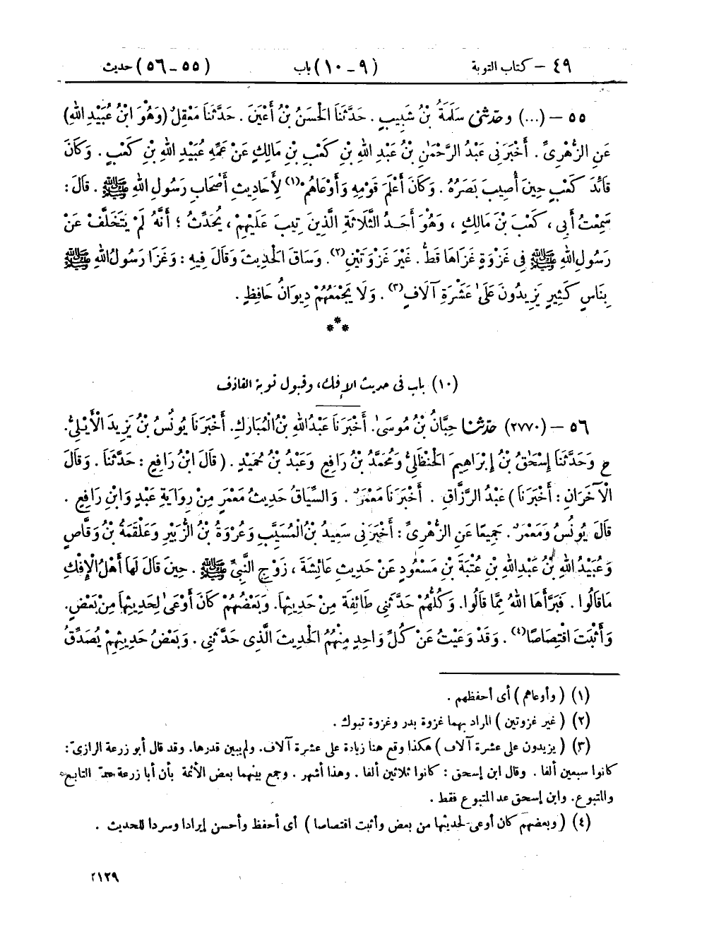 ٥٥ - (٢٧٦٩) وحَدَّثَنِي سَلَمَةُ بْنُ شَبِيبٍ، حَدَّثَنَا الْحَسَنُ بْنُ أَعْيَنَ، حَدَّثَنَا مَعْقِلٌ وَهُوَ ابْنُ عُبَيْدِ اللهِ، عَنِ الزُّهْرِيِّ، أَخْبَرَنِي عَبْدُ الرَّحْمَنِ بْنُ عَبْدِ اللهِ بْنِ كَعْبِ بْنِ مَالِكٍ، عَنْ عَمِّهِ عُبَيْدِ اللهِ بْنِ كَعْبٍ وَكَانَ قَائِدَ كَعْبٍ حِينَ أُصِيبَ بَصَرُهُ، وَكَانَ أَعْلَمَ قَوْمِهِ وَأَوْعَاهُمْ لِأَحَادِيثِ أَصْحَابِ رَسُولِ اللهِ صَلَّى اللهُ عَلَيْهِ وَسَلَّمَ، قَالَ: سَمِعْتُ أَبِي كَعْبَ بْنَ مَالِكٍ وَهُوَ أَحَدُ الثَّلَاثَةِ الَّذِينَ تِيبَ عَلَيْهِمْ، يُحَدِّثُ أَنَّهُ لَمْ يَتَخَلَّفْ عَنْ رَسُولِ اللهِ صَلَّى اللهُ عَلَيْهِ وَسَلَّمَ فِي غَزْوَةٍ غَزَاهَا قَطُّ، غَيْرَ غَزْوَتَيْنِ، وَسَاقَ الْحَدِيثَ وَقَالَ فِيهِ: وَغَزَا رَسُولُ اللهِ صَلَّى اللهُ عَلَيْهِ وَسَلَّمَ بِنَاسٍ كَثِيرٍ يَزِيدُونَ عَلَى عَشَرَةِ آلَافٍ، وَلَا يَجْمَعُهُمْ دِيوَانُ حَافِظٍ