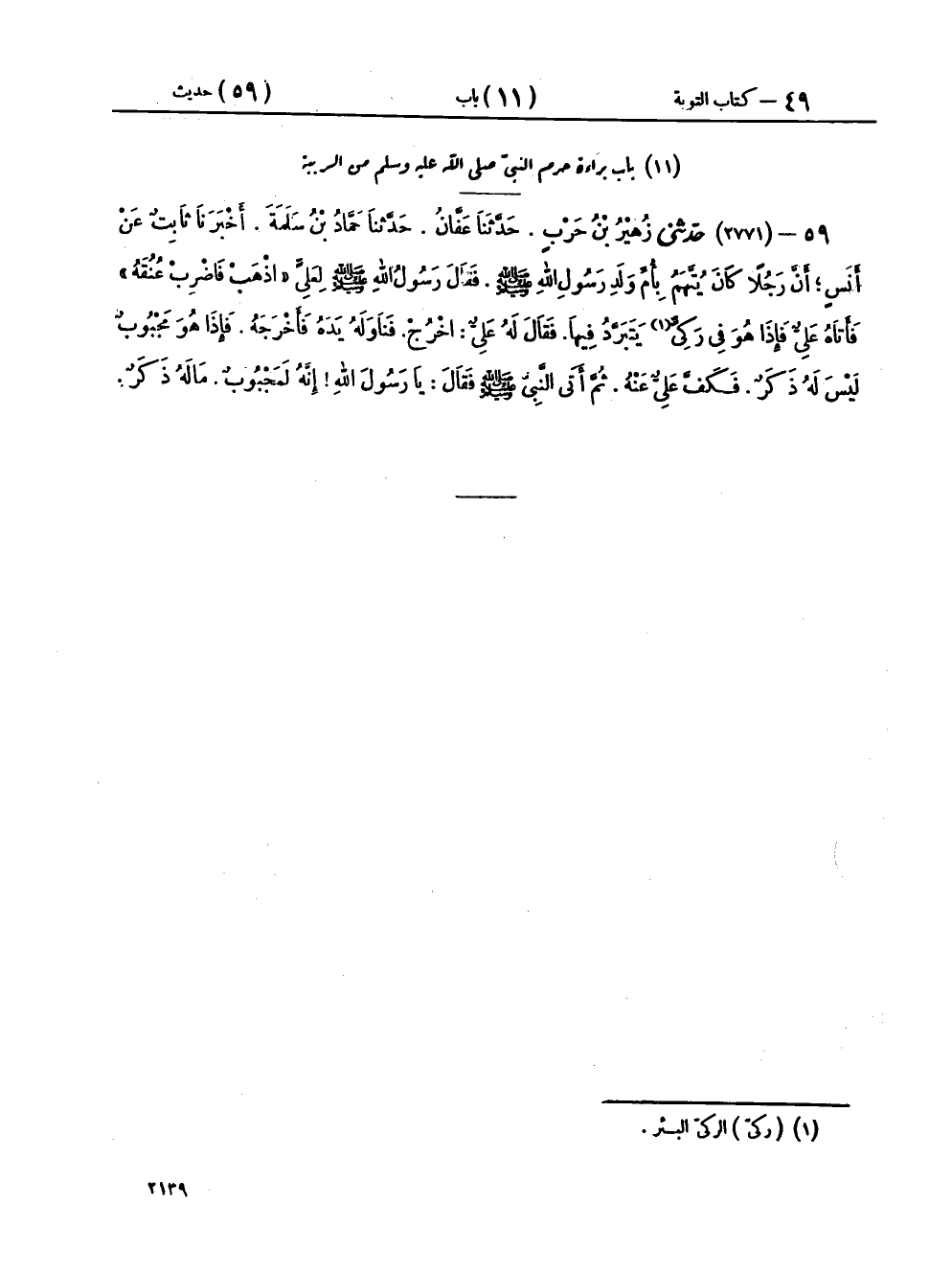٥٩ - (٢٧٧١) حَدَّثَنِي زُهَيْرُ بْنُ حَرْبٍ، حَدَّثَنَا عَفَّانُ، حَدَّثَنَا حَمَّادُ بْنُ سَلَمَةَ، أَخْبَرَنَا ثَابِتٌ، عَنْ أَنَسٍ، أَنَّ رَجُلًا كَانَ يُتَّهَمُ بِأُمِّ وَلَدِ رَسُولِ اللهِ صَلَّى اللهُ عَلَيْهِ وَسَلَّمَ، فَقَالَ رَسُولُ اللهِ صَلَّى اللهُ عَلَيْهِ وَسَلَّمَ لِعَلِيٍّ: «اذْهَبْ فَاضْرِبْ عُنُقَهُ» فَأَتَاهُ عَلِيٌّ فَإِذَا هُوَ فِي رَكِيٍّ يَتَبَرَّدُ فِيهَا، فَقَالَ لَهُ عَلِيٌّ: اخْرُجْ، فَنَاوَلَهُ يَدَهُ فَأَخْرَجَهُ، فَإِذَا هُوَ مَجْبُوبٌ لَيْسَ لَهُ ذَكَرٌ، فَكَفَّ عَلِيٌّ عَنْهُ، ثُمَّ أَتَى النَّبِيَّ صَلَّى اللهُ عَلَيْهِ وَسَلَّمَ، فَقَالَ: يَا رَسُولَ اللهِ إِنَّهُ لَمَجْبُوبٌ مَا لَهُ ذَكَرٌ