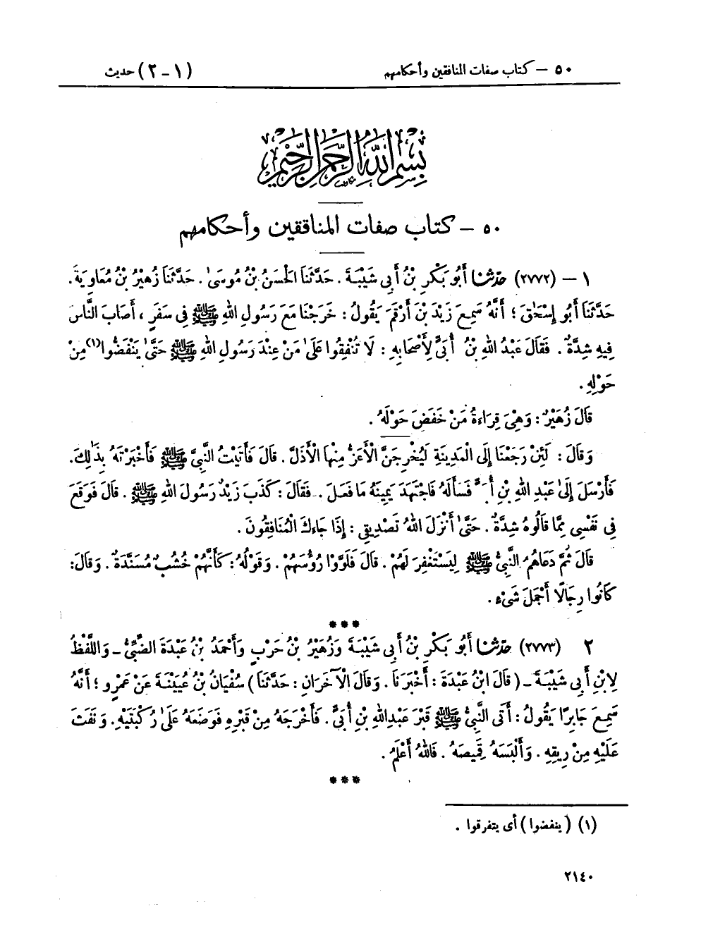 ١ - (٢٧٧٢) حَدَّثَنَا أَبُو بَكْرِ بْنُ أَبِي شَيْبَةَ، حَدَّثَنَا الْحَسَنُ بْنُ مُوسَى، حَدَّثَنَا زُهَيْرُ بْنُ مُعَاوِيَةَ، حَدَّثَنَا أَبُو إِسْحَاقَ، أَنَّهُ سَمِعَ زَيْدَ بْنَ أَرْقَمَ، يَقُولُ: «خَرَجْنَا مَعَ رَسُولِ اللهِ صَلَّى اللهُ عَلَيْهِ وَسَلَّمَ فِي سَفَرٍ أَصَابَ النَّاسَ فِيهِ شِدَّةٌ» فَقَالَ عَبْدُ اللهِ بْنُ أُبَيٍّ لِأَصْحَابِهِ: لَا تُنْفِقُوا عَلَى مَنْ عِنْدَ رَسُولِ اللهِ حَتَّى يَنْفَضُّوا مِنْ حَوْلِهِ، قَالَ زُهَيْرٌ: وَهِيَ قِرَاءَةُ مَنْ خَفَضَ حَوْلَهُ، وَقَالَ: {لَئِنْ رَجَعْنَا إِلَى الْمَدِينَةِ لَيُخْرِجَنَّ الْأَعَزُّ مِنْهَا الْأَذَلَّ} [المنافقون: ٨] قَالَ: فَأَتَيْتُ النَّبِيَّ صَلَّى اللهُ عَلَيْهِ وَسَلَّمَ، فَأَخْبَرْتُهُ بِذَلِكَ فَأَرْسَلَ إِلَى عَبْدِ اللهِ بْنِ أُبَيٍّ فَسَأَلَهُ فَاجْتَهَدَ يَمِينَهُ مَا فَعَلَ، فَقَالَ: كَذَبَ زَيْدٌ رَسُولَ اللهِ صَلَّى اللهُ عَلَيْهِ وَسَلَّمَ قَالَ: فَوَقَعَ فِي نَفْسِي مِمَّا قَالُوهُ شِدَّةٌ حَتَّى أَنْزَلَ اللهُ تَصْدِيقِي {إِذَا جَاءَكَ الْمُنَافِقُونَ} [المنافقون: ١] قَالَ: ثُمَّ «دَعَاهُمُ النَّبِيُّ صَلَّى اللهُ عَلَيْهِ وَسَلَّمَ لِيَسْتَغْفِرَ لَهُمْ»، قَالَ: فَلَوَّوْا رُءُوسَهُمْ، وقَوْلُهُ {كَأَنَّهُمْ خُشُبٌ مُسَنَّدَةٌ} [المنافقون: ٤] وَقَالَ: كَانُوا رِجَالًا أَجْمَلَ شَيْءٍ