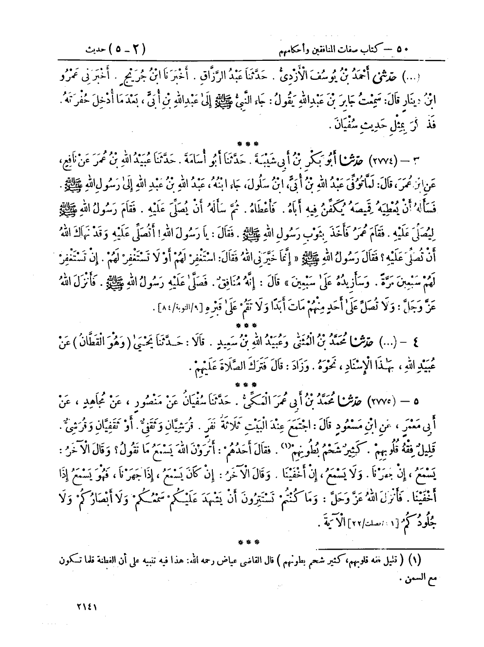 ٣ - (٢٧٧٤) حَدَّثَنَا أَبُو بَكْرِ بْنُ أَبِي شَيْبَةَ، حَدَّثَنَا أَبُو أُسَامَةَ، حَدَّثَنَا عُبَيْدُ اللهِ بْنُ عُمَرَ، عَنْ نَافِعٍ، عَنِ ابْنِ عُمَرَ، قَالَ: لَمَّا تُوُفِّيَ عَبْدُ اللهِ بْنُ أُبَيٍّ ابْنُ سَلُولَ جَاءَ ابْنُهُ عَبْدُ اللهِ بْنُ عَبْدِ اللهِ إِلَى رَسُولِ اللهِ صَلَّى اللهُ عَلَيْهِ وَسَلَّمَ، فَسَأَلَهُ أَنْ يُعْطِيَهُ قَمِيصَهُ يُكَفِّنُ فِيهِ أَبَاهُ، فَأَعْطَاهُ ثُمَّ سَأَلَهُ أَنْ يُصَلِّيَ عَلَيْهِ؟ فَقَامَ رَسُولُ اللهِ صَلَّى اللهُ عَلَيْهِ وَسَلَّمَ لِيُصَلِّيَ عَلَيْهِ، فَقَامَ عُمَرُ فَأَخَذَ بِثَوْبِ رَسُولِ اللهِ صَلَّى اللهُ عَلَيْهِ وَسَلَّمَ، فَقَالَ: يَا رَسُولَ اللهِ أَتُصَلِّي عَلَيْهِ وَقَدْ نَهَاكَ اللهُ أَنْ تُصَلِّيَ عَلَيْهِ؟ فَقَالَ رَسُولُ اللهِ صَلَّى اللهُ عَلَيْهِ وَسَلَّمَ: " إِنَّمَا خَيَّرَنِي اللهُ فَقَالَ: اسْتَغْفِرْ لَهُمْ أَوْ لَا تَسْتَغْفِرْ لَهُمْ، إِنْ تَسْتَغْفِرْ لَهُمْ سَبْعِينَ مَرَّةً، وَسَأَزِيدُهُ عَلَى سَبْعِينَ " قَالَ: إِنَّهُ مُنَافِقٌ، فَصَلَّى عَلَيْهِ رَسُولُ اللهِ صَلَّى اللهُ عَلَيْهِ وَسَلَّمَ فَأَنْزَلَ اللهُ عَزَّ وَجَلَّ: {وَلَا تُصَلِّ عَلَى أَحَدٍ مِنْهُمْ مَاتَ أَبَدًا وَلَا تَقُمْ عَلَى قَبْرِهِ} [التوبة: ٨٤]،