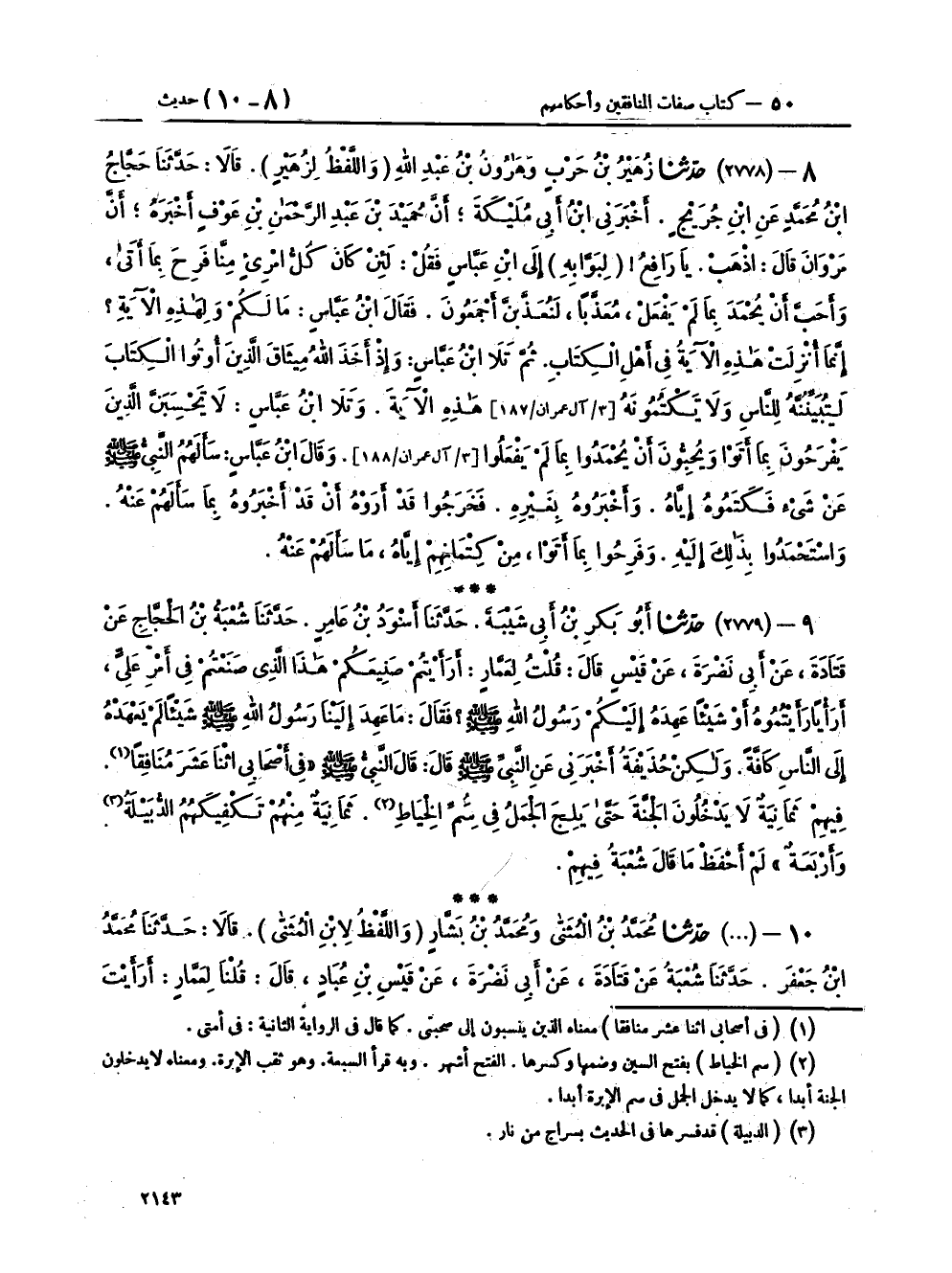 ٨ - (٢٧٧٨) حَدَّثَنَا زُهَيْرُ بْنُ حَرْبٍ، وَهَارُونُ بْنُ عَبْدِ اللهِ - وَاللَّفْظُ لِزُهَيْرٍ - قَالَا: حَدَّثَنَا حَجَّاجُ بْنُ مُحَمَّدٍ، عَنِ ابْنِ جُرَيْجٍ، أَخْبَرَنِي ابْنُ أَبِي مُلَيْكَةَ، أَنَّ حُمَيْدَ بْنَ عَبْدِ الرَّحْمَنِ بْنِ عَوْفٍ، أَخْبَرَهُ أَنَّ مَرْوَانَ، قَالَ: اذْهَبْ يَا رَافِعُ - لِبَوَّابِهِ - إِلَى ابْنِ عَبَّاسٍ فَقُلْ: لَئِنْ كَانَ كُلُّ امْرِئٍ مِنَّا فَرِحَ بِمَا أَتَى وَأَحَبَّ أَنْ يُحْمَدَ بِمَا لَمْ يَفْعَلْ، مُعَذَّبًا لَنُعَذَّبَنَّ أَجْمَعُونَ، فَقَالَ ابْنُ عَبَّاسٍ: مَا لَكُمْ وَلِهَذِهِ الْآيَةِ؟ إِنَّمَا أُنْزِلَتْ هَذِهِ الْآيَةُ فِي أَهْلِ الْكِتَابِ، ثُمَّ تَلَا ابْنُ عَبَّاسٍ: {وَإِذْ أَخَذَ اللهُ مِيثَاقَ الَّذِينَ أُوتُوا الْكِتَابَ لَتُبَيِّنُنَّهُ لِلنَّاسِ وَلَا تَكْتُمُونَهُ} [آل عمران: ١٨٧] هَذِهِ الْآيَةَ، وَتَلَا ابْنُ عَبَّاسٍ: {لَا تَحْسَبَنَّ الَّذِينَ يَفْرَحُونَ بِمَا أَتَوْا وَيُحِبُّونَ أَنْ يُحْمَدُوا بِمَا لَمْ يَفْعَلُوا} [آل عمران: ١٨٨]، وَقَالَ ابْنُ عَبَّاسٍ: «سَأَلَهُمُ النَّبِيُّ صَلَّى اللهُ عَلَيْهِ وَسَلَّمَ عَنْ شَيْءٍ فَكَتَمُوهُ، إِيَّاهُ وَأَخْبَرُوهُ بِغَيْرِهِ، فَخَرَجُوا قَدْ أَرَوْهُ أَنْ قَدْ أَخْبَرُوهُ بِمَا سَأَلَهُمْ عَنْهُ وَاسْتَحْمَدُوا بِذَلِكَ إِلَيْهِ، وَفَرِحُوا بِمَا أَتَوْا مِنْ كِتْمَانِهِمْ إِيَّاهُ، مَا سَأَلَهُمْ عَنْهُ»