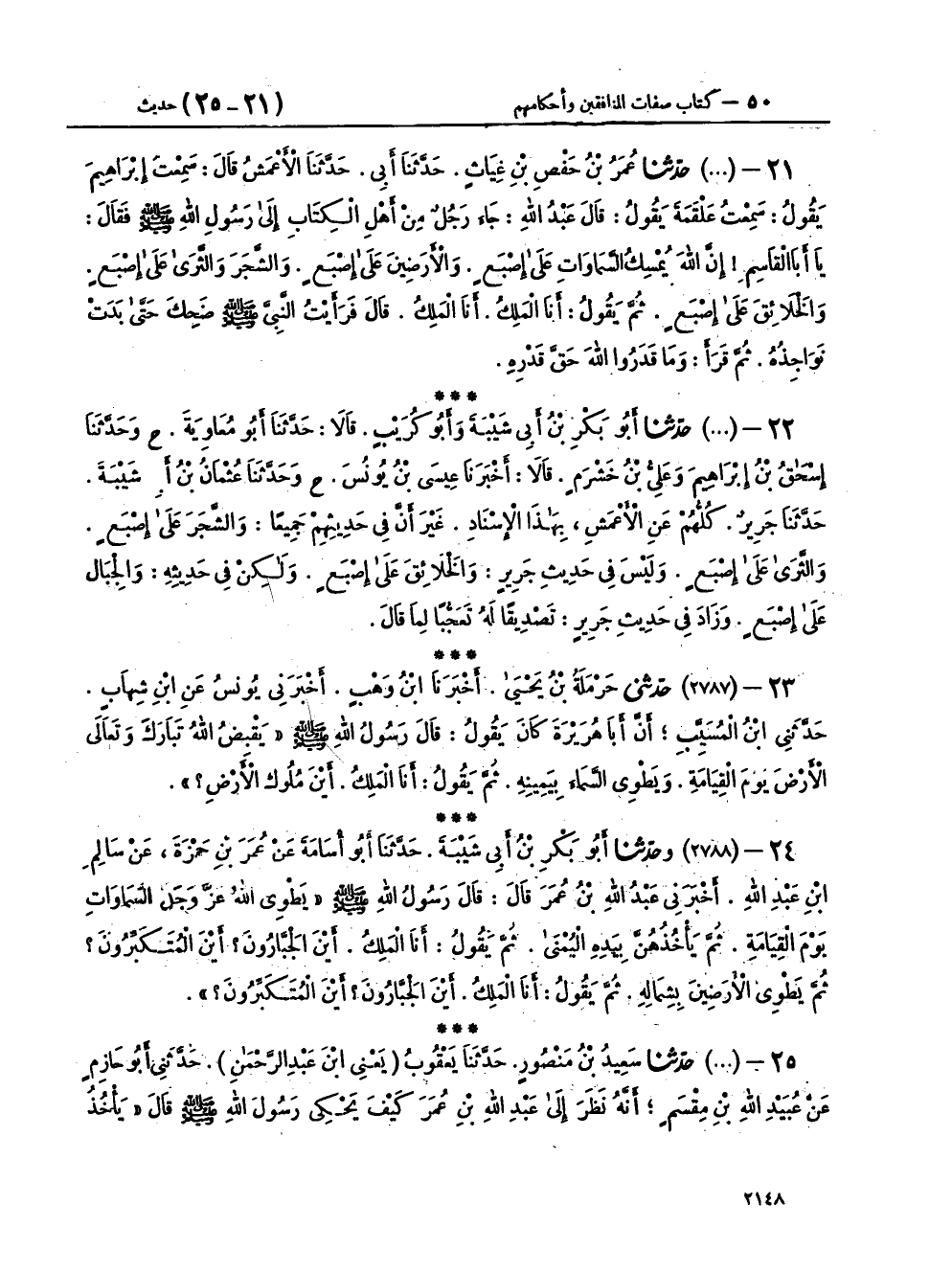 ٢١ - (٢٧٨٦) حَدَّثَنَا عُمَرُ بْنُ حَفْصِ بْنِ غِيَاثٍ، حَدَّثَنَا أَبِي، حَدَّثَنَا الْأَعْمَشُ، قَالَ: سَمِعْتُ إِبْرَاهِيمَ، يَقُولُ: سَمِعْتُ عَلْقَمَةَ، يَقُولُ: قَالَ عَبْدُ اللهِ جَاءَ رَجُلٌ مِنْ أَهْلِ الْكِتَابِ إِلَى رَسُولِ اللهِ صَلَّى اللهُ عَلَيْهِ وَسَلَّمَ فَقَالَ: يَا أَبَا الْقَاسِمِ إِنَّ اللهَ يُمْسِكُ السَّمَوَاتِ عَلَى إِصْبَعٍ، وَالْأَرْضِينَ عَلَى إِصْبَعٍ، وَالشَّجَرَ وَالثَّرَى عَلَى إِصْبَعٍ، وَالْخَلَائِقَ عَلَى إِصْبَعٍ، ثُمَّ يَقُولُ: أَنَا الْمَلِكُ، أَنَا الْمَلِكُ، قَالَ " فَرَأَيْتُ النَّبِيَّ صَلَّى اللهُ عَلَيْهِ وَسَلَّمَ ضَحِكَ حَتَّى بَدَتْ نَوَاجِذُهُ، ثُمَّ قَرَأَ: {وَمَا قَدَرُوا اللهَ حَقَّ قَدْرِهِ} [الأنعام: ٩١] "،
