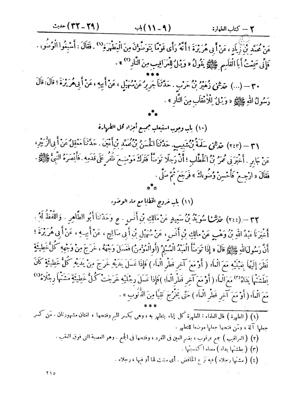 ٣٠ - (٢٤٢) حَدَّثَنِي زُهَيْرُ بْنُ حَرْبٍ، حَدَّثَنَا جَرِيرٌ، عَنْ سُهَيْلٍ، عَنْ أَبِيهِ، عَنْ أَبِي هُرَيْرَةَ، قَالَ: قَالَ رَسُولُ اللهِ صَلَّى اللهُ عَلَيْهِ وَسَلَّمَ: «وَيْلٌ لِلْأَعْقَابِ مِنَ النَّارِ»