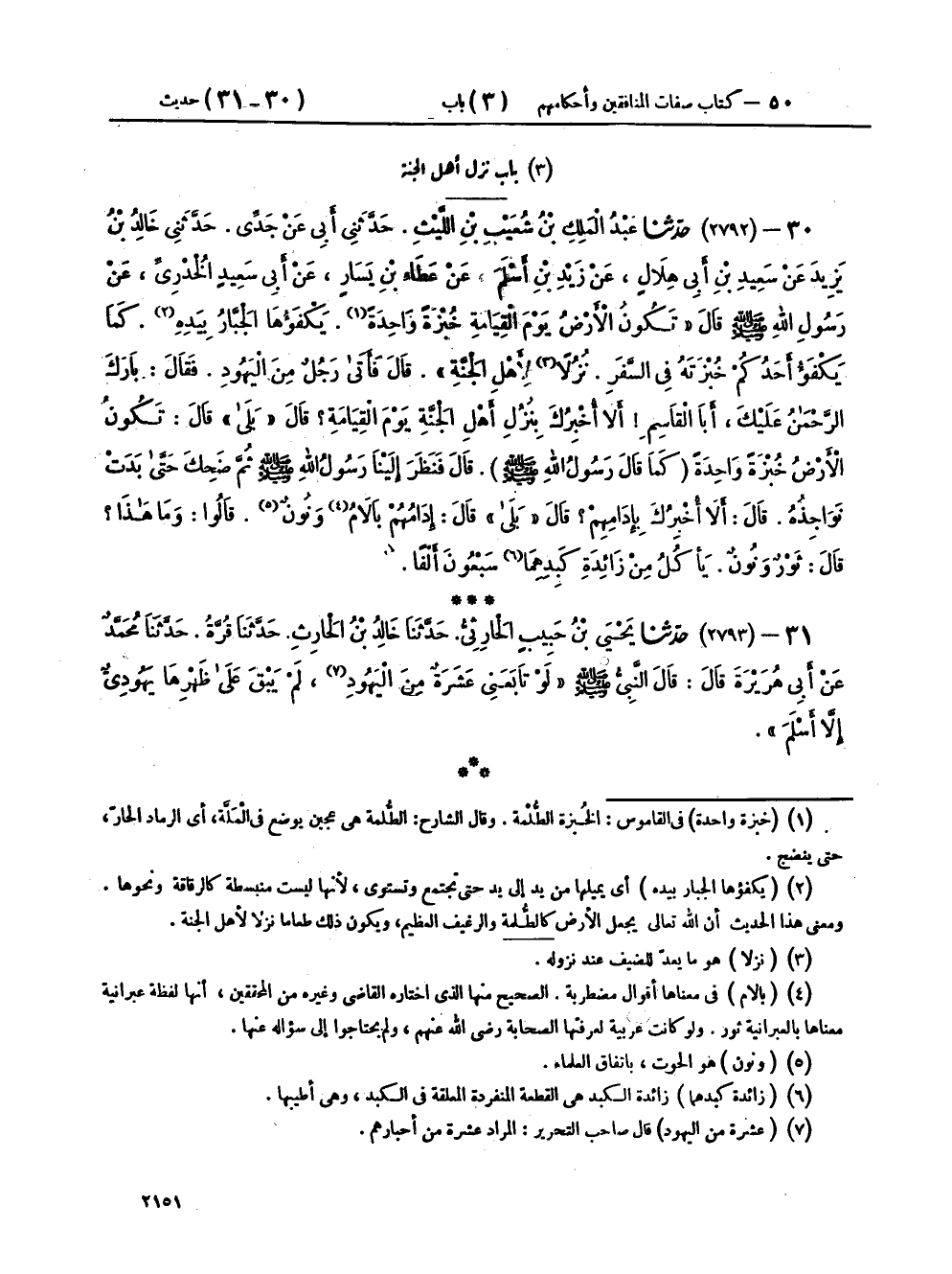 ٣٠ - (٢٧٩٢) حَدَّثَنَا عَبْدُ الْمَلِكِ بْنُ شُعَيْبِ بْنِ اللَّيْثِ، حَدَّثَنِي أَبِي، عَنْ جَدِّي، حَدَّثَنِي خَالِدُ بْنُ يَزِيدَ، عَنْ سَعِيدِ بْنِ أَبِي هِلَالٍ، عَنْ زَيْدِ بْنِ أَسْلَمَ، عَنْ عَطَاءِ بْنِ يَسَارٍ، عَنْ أَبِي سَعِيدٍ الْخُدْرِيِّ، عَنْ رَسُولِ اللهِ صَلَّى اللهُ عَلَيْهِ وَسَلَّمَ، قَالَ: «تَكُونُ الْأَرْضُ يَوْمَ الْقِيَامَةِ خُبْزَةً وَاحِدَةً، يَكْفَؤُهَا الْجَبَّارُ بِيَدِهِ، كَمَا يَكْفَأُ أَحَدُكُمْ خُبْزَتَهُ فِي السَّفَرِ، نُزُلًا لِأَهْلِ الْجَنَّةِ» قَالَ: فَأَتَى رَجُلٌ مِنَ الْيَهُودِ، فَقَالَ: بَارَكَ الرَّحْمَنُ عَلَيْكَ، أَبَا الْقَاسِمِ أَلَا أُخْبِرُكَ بِنُزُلِ أَهْلِ الْجَنَّةِ يَوْمَ الْقِيَامَةِ؟ قَالَ: «بَلَى» قَالَ: تَكُونُ الْأَرْضُ خُبْزَةً وَاحِدَةً - كَمَا قَالَ رَسُولُ اللهِ صَلَّى اللهُ عَلَيْهِ وَسَلَّمَ - قَالَ: فَنَظَرَ إِلَيْنَا رَسُولُ اللهِ صَلَّى اللهُ عَلَيْهِ وَسَلَّمَ، ثُمَّ ضَحِكَ حَتَّى بَدَتْ نَوَاجِذُهُ، قَالَ: أَلَا أُخْبِرُكَ بِإِدَامِهِمْ؟ قَالَ: «بَلَى» قَالَ: إِدَامُهُمْ بَالَامُ وَنُونٌ، قَالُوا: وَمَا هَذَا؟ قَالَ: «ثَوْرٌ وَنُونٌ، يَأْكُلُ مِنْ زَائِدَةِ كَبِدِهِمَا سَبْعُونَ أَلْفًا»