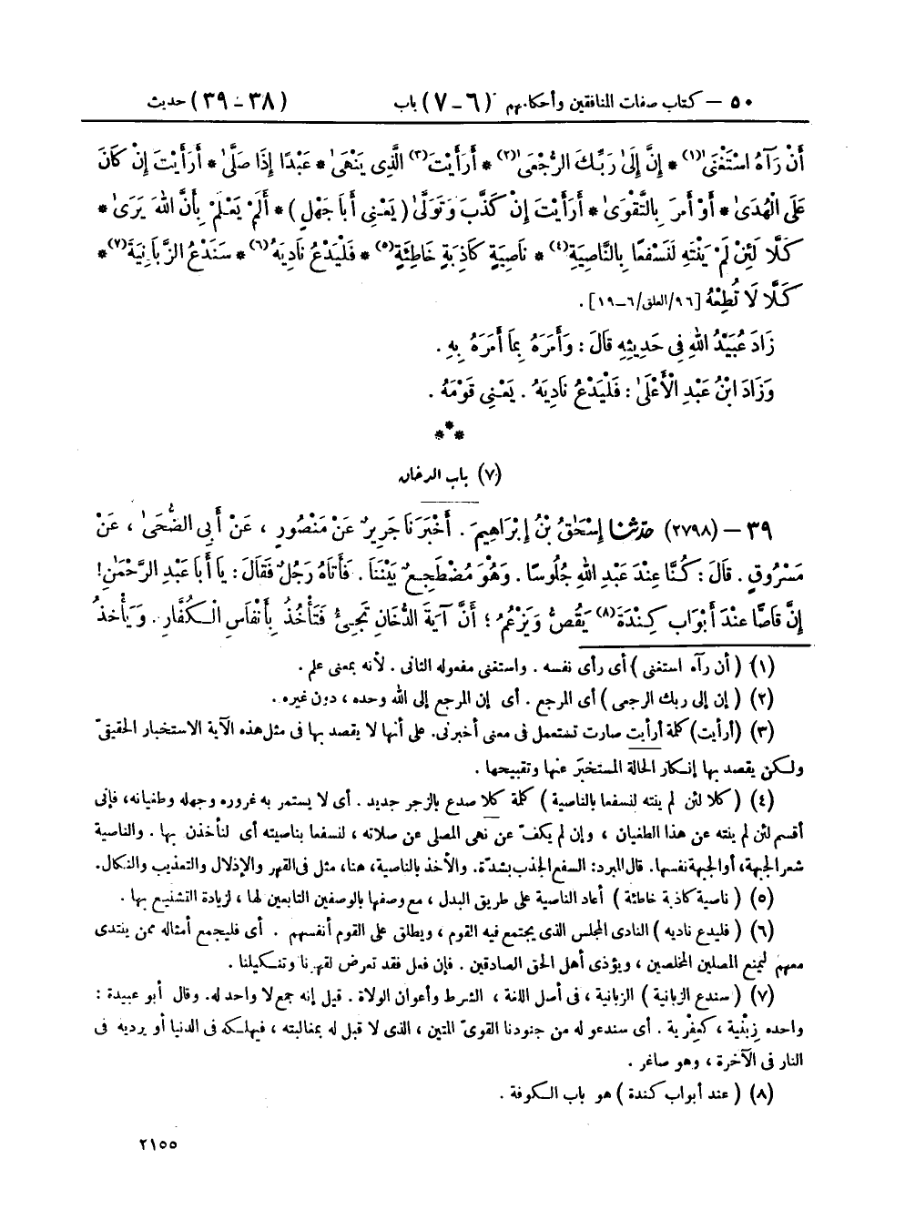 ٣٩ - (٢٧٩٨) حَدَّثَنَا إِسْحَاقُ بْنُ إِبْرَاهِيمَ، أَخْبَرَنَا جَرِيرٌ، عَنْ مَنْصُورٍ، عَنْ أَبِي الضُّحَى، عَنْ مَسْرُوقٍ، قَالَ: كُنَّا عِنْدَ عَبْدِ اللهِ جُلُوسًا، وَهُوَ مُضْطَجِعٌ بَيْنَنَا، فَأَتَاهُ رَجُلٌ فَقَالَ: يَا أَبَا عَبْدِ الرَّحْمَنِ إِنَّ قَاصًّا عِنْدَ أَبْوَابِ كِنْدَةَ يَقُصُّ وَيَزْعُمُ، أَنَّ آيَةَ الدُّخَانِ تَجِيءُ فَتَأْخُذُ بِأَنْفَاسِ الْكُفَّارِ، وَيَأْخُذُ الْمُؤْمِنِينَ مِنْهُ كَهَيْئَةِ الزُّكَامِ، فَقَالَ عَبْدُ اللهِ: وَجَلَسَ وَهُوَ غَضْبَانُ: يَا أَيَّهَا النَّاسُ اتَّقُوا اللهَ، مَنْ عَلِمَ مِنْكُمْ شَيْئًا، فَلْيَقُلْ بِمَا يَعْلَمُ، وَمَنْ لَمْ يَعْلَمْ فَلْيَقُلْ: اللهُ أَعْلَمُ، فَإِنَّهُ أَعْلَمُ لِأَحَدِكُمْ أَنْ يَقُولَ: لِمَا لَا يَعْلَمُ: اللهُ أَعْلَمُ، فَإِنَّ اللهَ عَزَّ وَجَلَّ قَالَ لِنَبِيِّهِ صَلَّى اللهُ عَلَيْهِ وَسَلَّمَ: {قُلْ مَا أَسْأَلُكُمْ عَلَيْهِ مِنْ أَجْرٍ وَمَا أَنَا مِنَ الْمُتَكَلِّفِينَ} [ص: ٨٦] إِنَّ رَسُولَ اللهِ صَلَّى اللهُ عَلَيْهِ وَسَلَّمَ لَمَّا رَأَى مِنَ النَّاسِ إِدْبَارًا، فَقَالَ: «اللهُمَّ سَبْعٌ كَسَبْعِ يُوسُفَ» قَالَ: فَأَخَذَتْهُمْ سَنَةٌ حَصَّتْ كُلَّ شَيْءٍ، حَتَّى أَكَلُوا الْجُلُودَ وَالْمَيْتَةَ مِنَ الْجُوعِ، وَيَنْظُرُ إِلَى السَّمَاءِ أَحَدُهُمْ فَيَرَى كَهَيْئَةِ الدُّخَانِ، فَأَتَاهُ أَبُو سُفْيَانَ فَقَالَ: يَا مُحَمَّدُ إِنَّكَ جِئْتَ تَأْمُرُ بِطَاعَةِ اللهِ، وَبِصِلَةِ الرَّحِمِ، وَإِنَّ قَوْمَكَ قَدْ هَلَكُوا، فَادْعُ اللهَ لَهُمْ، قَالَ اللهُ عَزَّ وَجَلَّ: {فَارْتَقِبْ يَوْمَ تَأْتِي السَّمَاءُ بِدُخَانٍ مُبِينٍ، يَغْشَى النَّاسَ هَذَا عَذَابٌ أَلِيمٌ} [الدخان: ١١] إِلَى قَوْلِهِ: {إِنَّكُمْ عَائِدُونَ} [الدخان: ١٥]، قَالَ: أَفَيُكْشَفُ عَذَابُ الْآخِرَةِ؟ {يَوْمَ نَبْطِشُ الْبَطْشَةَ الْكُبْرَى إِنَّا مُنْتَقِمُونَ} [الدخان: ١٦] فَالْبَطْشَةُ يَوْمَ بَدْرٍ، وَقَدْ مَضَتْ آيَةُ الدُّخَانِ، وَالْبَطْشَةُ وَاللِّزَامُ، وَآيَةُ الرُّومِ