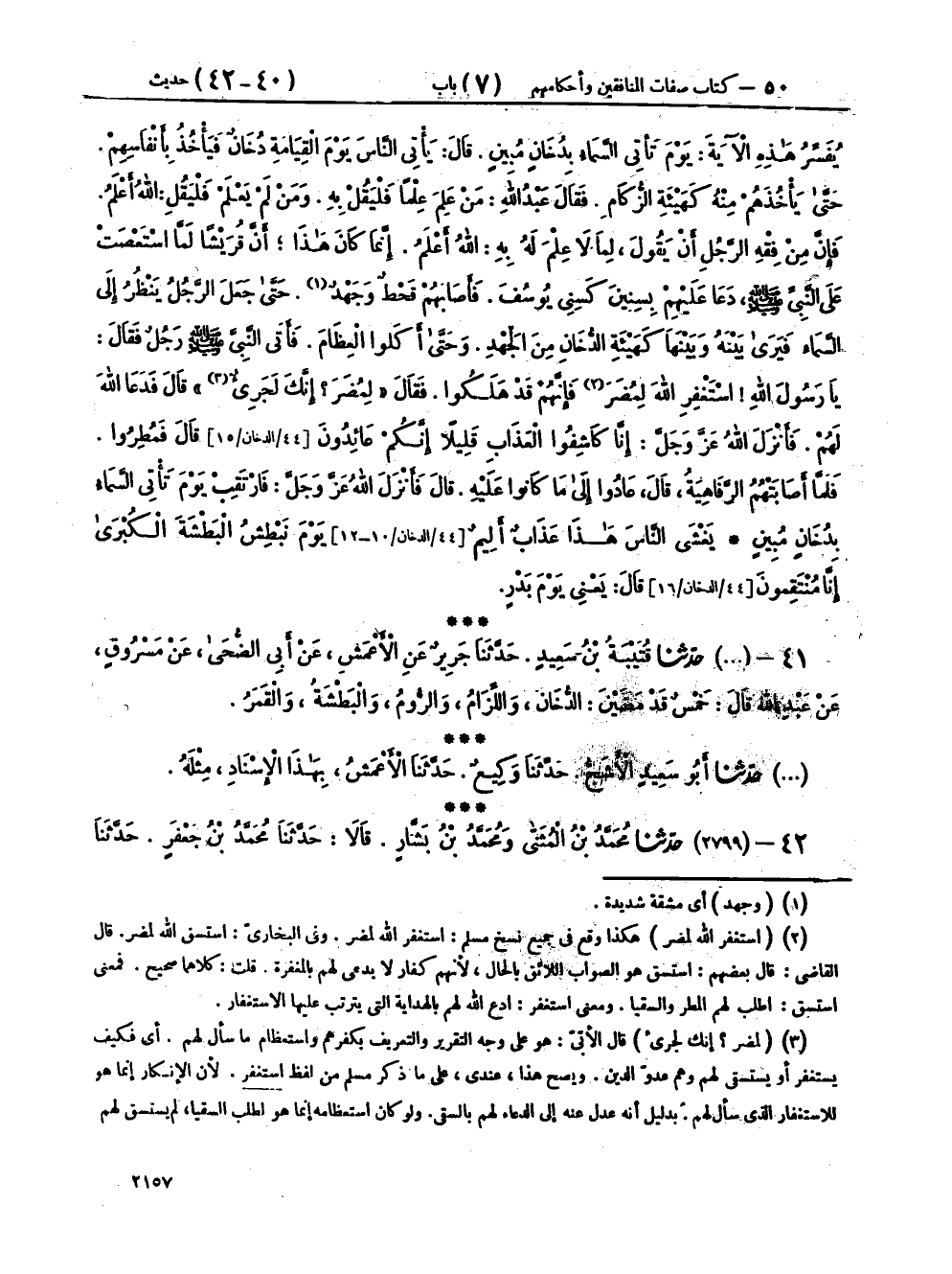 ٤١ - (٢٧٩٨) حَدَّثَنَا قُتَيْبَةُ بْنُ سَعِيدٍ، حَدَّثَنَا جَرِيرٌ، عَنِ الْأَعْمَشِ، عَنْ أَبِي الضُّحَى، عَنْ مَسْرُوقٍ، عَنْ عَبْدِ اللهِ، قَالَ: «خَمْسٌ قَدْ مَضَيْنَ الدُّخَانُ، وَاللِّزَامُ، وَالرُّومُ، وَالْبَطْشَةُ، وَالْقَمَرُ»،