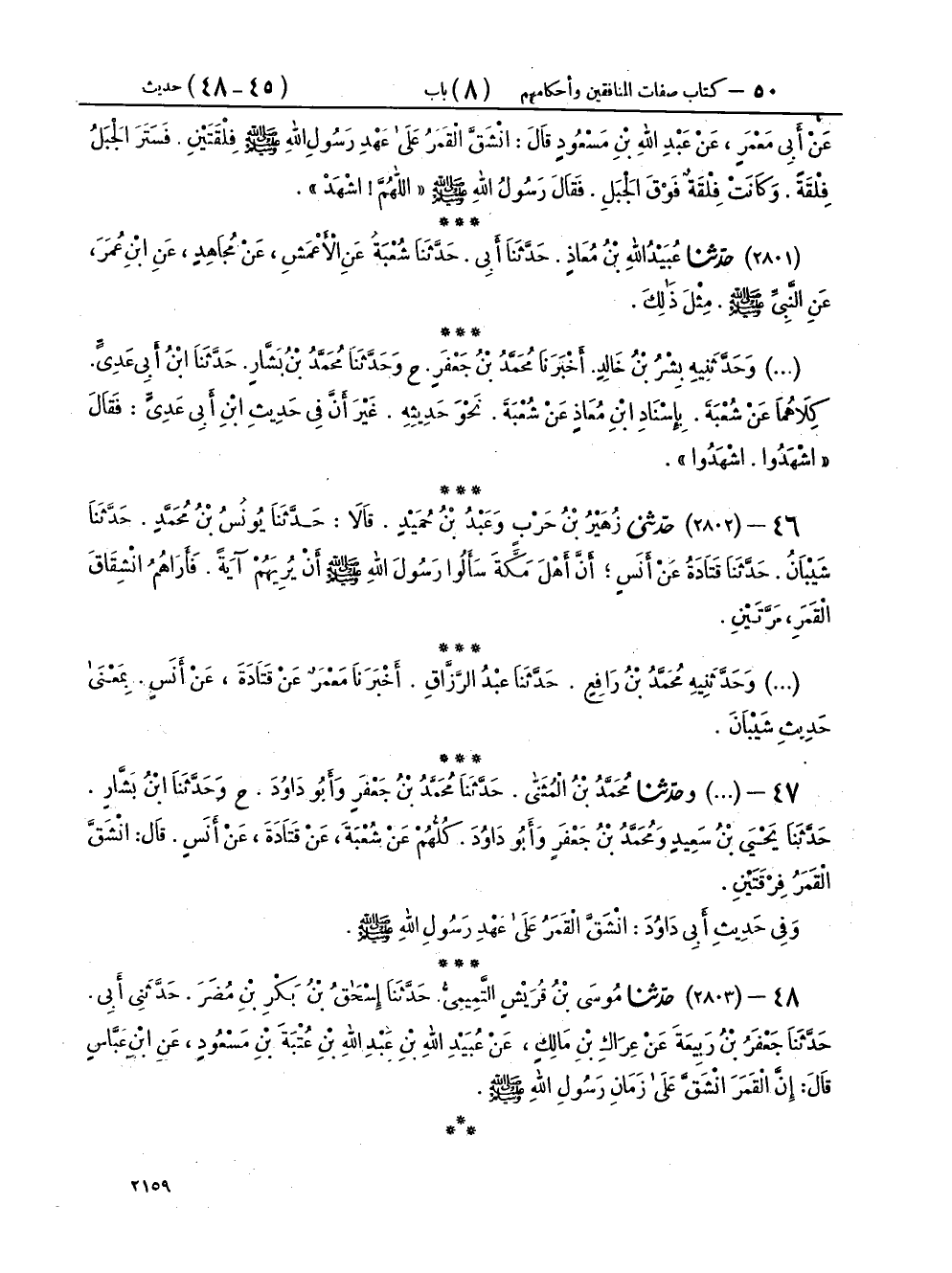 ٤٨ - (٢٨٠٣) حَدَّثَنَا مُوسَى بْنُ قُرَيْشٍ التَّمِيمِيُّ، حَدَّثَنَا إِسْحَاقُ بْنُ بَكْرِ بْنِ مُضَرَ، حَدَّثَنِي أَبِي، حَدَّثَنَا جَعْفَرُ بْنُ رَبِيعَةَ، عَنْ عِرَاكِ بْنِ مَالِكٍ، عَنْ عُبَيْدِ اللهِ بْنِ عَبْدِ اللهِ بْنِ عُتْبَةَ بْنِ مَسْعُودٍ، عَنِ ابْنِ عَبَّاسٍ، قَالَ: «إِنَّ الْقَمَرَ انْشَقَّ عَلَى زَمَانِ رَسُولِ اللهِ صَلَّى اللهُ عَلَيْهِ وَسَلَّمَ»