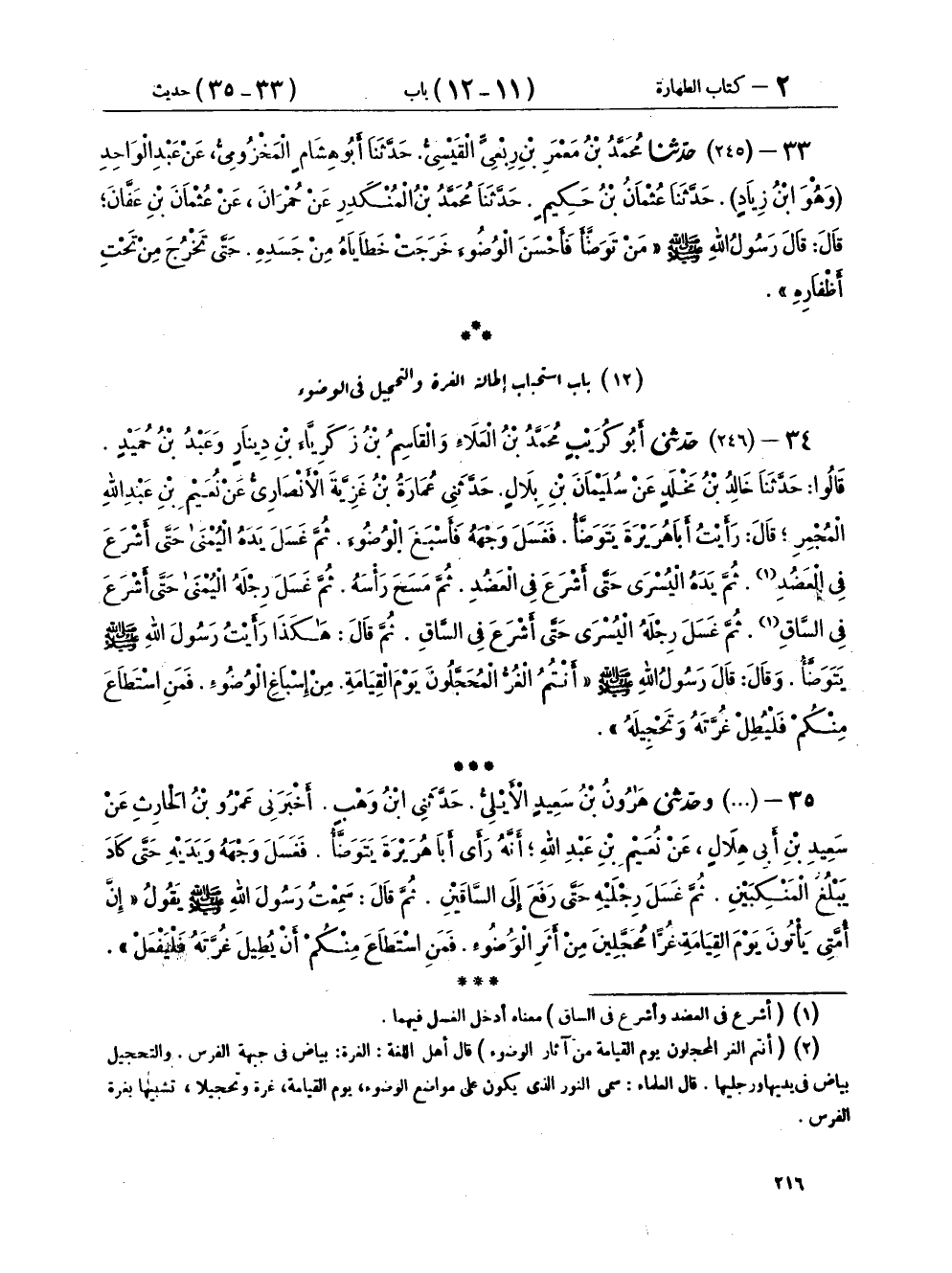 ١٢ - بَابُ اسْتحْبَابِ إِطَالَةِ الْغُرَّةِ وَالتَّحْجِيلِ فِي الْوُضُوءِ