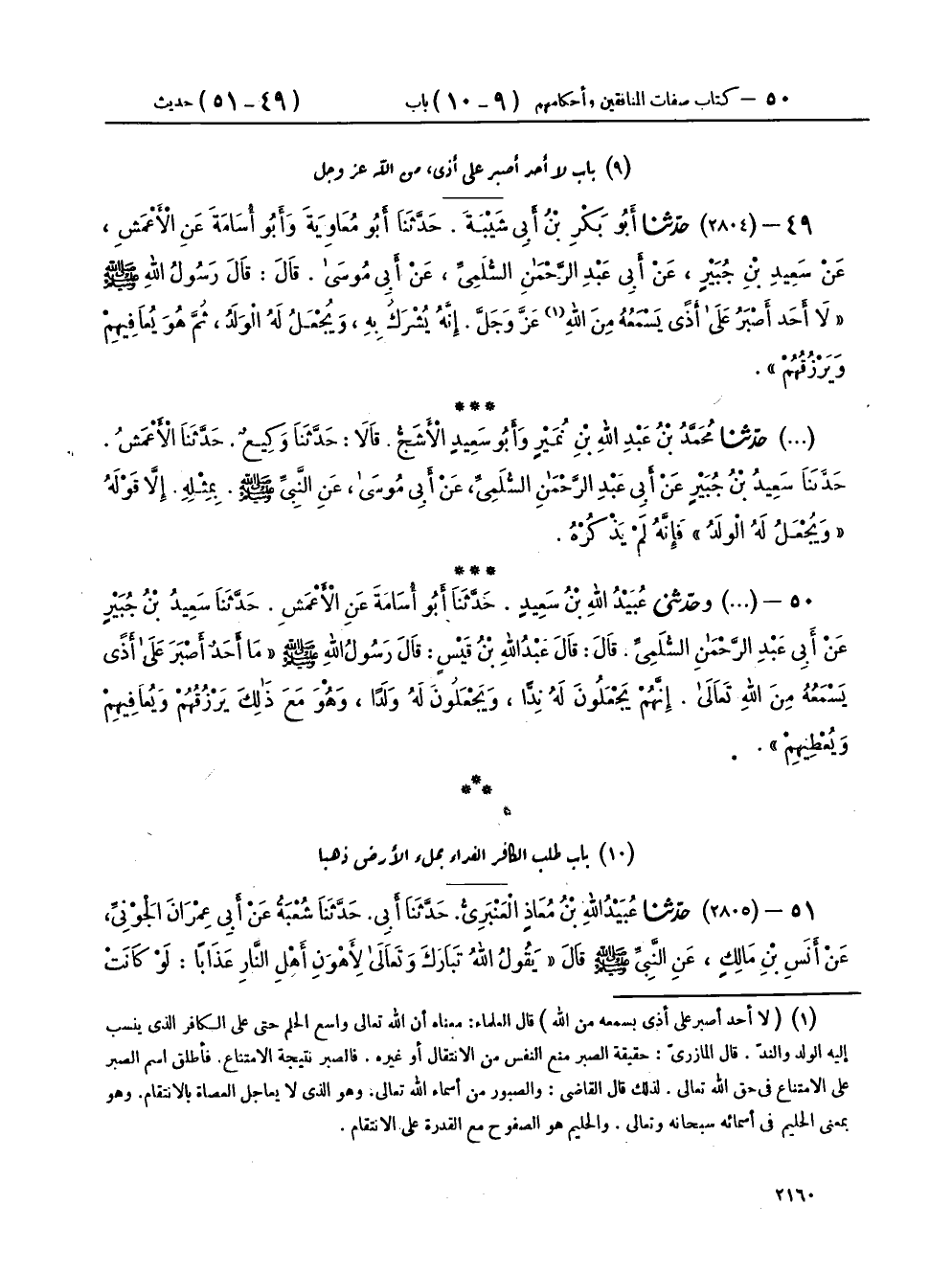 ٤٩ - (٢٨٠٤) حَدَّثَنَا أَبُو بَكْرِ بْنُ أَبِي شَيْبَةَ، حَدَّثَنَا أَبُو مُعَاوِيَةَ، وَأَبُو أُسَامَةَ، عَنِ الْأَعْمَشِ، عَنْ سَعِيدِ بْنِ جُبَيْرٍ، عَنْ أَبِي عَبْدِ الرَّحْمَنِ السُّلَمِيِّ، عَنْ أَبِي مُوسَى، قَالَ: قَالَ رَسُولُ اللهِ صَلَّى اللهُ عَلَيْهِ وَسَلَّمَ: «لَا أَحَدَ أَصْبَرُ عَلَى أَذًى يَسْمَعُهُ مِنَ اللهِ عَزَّ وَجَلَّ، إِنَّهُ يُشْرَكُ بِهِ، وَيُجْعَلُ لَهُ الْوَلَدُ، ثُمَّ هُوَ يُعَافِيهِمْ وَيَرْزُقُهُمْ»،