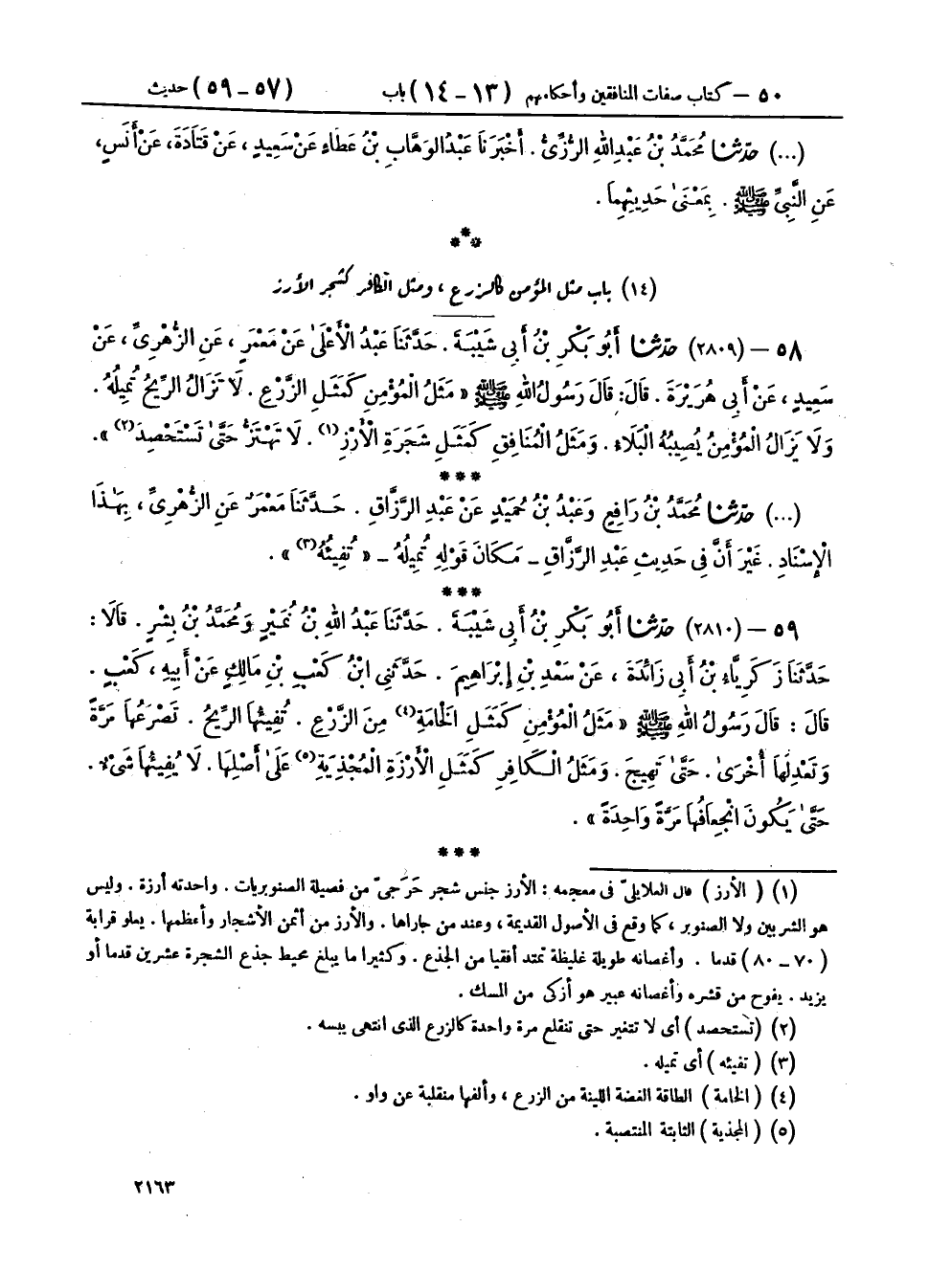 ٥٩ - (٢٨١٠) حَدَّثَنَا أَبُو بَكْرِ بْنُ أَبِي شَيْبَةَ، حَدَّثَنَا عَبْدُ اللهِ بْنُ نُمَيْرٍ، وَمُحَمَّدُ بْنُ بِشْرٍ، قَالَا: حَدَّثَنَا زَكَرِيَّاءُ بْنُ أَبِي زَائِدَةَ، عَنْ سَعْدِ بْنِ إِبْرَاهِيمَ، حَدَّثَنِي ابْنُ كَعْبِ بْنِ مَالِكٍ، عَنْ أَبِيهِ كَعْبٍ قَالَ: قَالَ رَسُولُ اللهِ صَلَّى اللهُ عَلَيْهِ وَسَلَّمَ: «مَثَلُ الْمُؤْمِنِ كَمَثَلِ الْخَامَةِ مِنَ الزَّرْعِ، تُفِيئُهَا الرِّيحُ، تَصْرَعُهَا مَرَّةً وَتَعْدِلُهَا أُخْرَى، حَتَّى تَهِيجَ، وَمَثَلُ الْكَافِرِ كَمَثَلِ الْأَرْزَةِ الْمُجْذِيَةِ عَلَى أَصْلِهَا، لَا يُفِيئُهَا شَيْءٌ، حَتَّى يَكُونَ انْجِعَافُهَا مَرَّةً وَاحِدَةً»