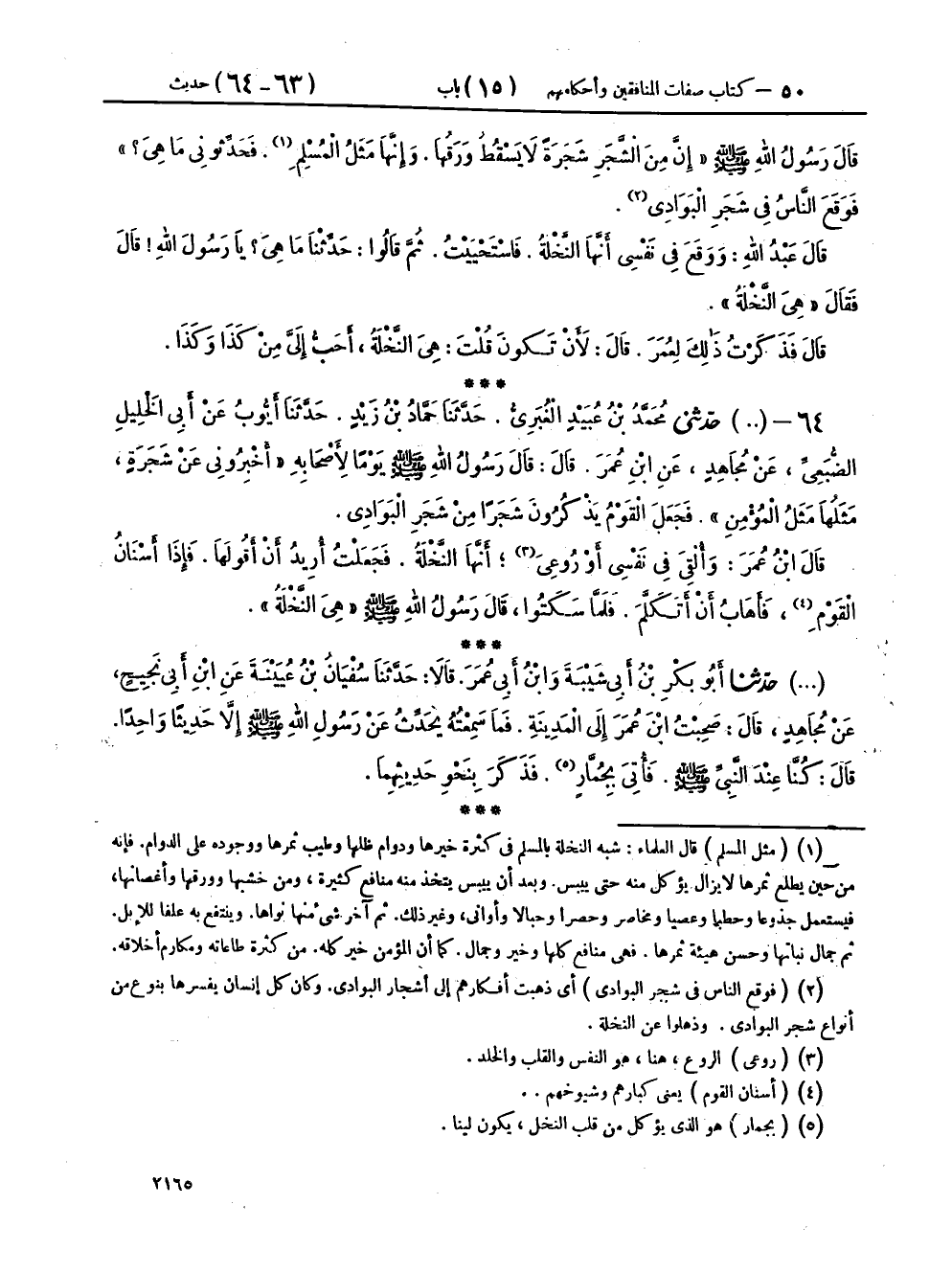 ٦٤ - (٢٨١١) حَدَّثَنِي مُحَمَّدُ بْنُ عُبَيْدٍ الْغُبَرِيُّ، حَدَّثَنَا حَمَّادُ بْنُ زَيْدٍ، حَدَّثَنَا أَيُّوبُ، عَنْ أَبِي الْخَلِيلِ الضُّبَعِيِّ، عَنْ مُجَاهِدٍ، عَنِ ابْنِ عُمَرَ، قَالَ: قَالَ رَسُولُ اللهِ صَلَّى اللهُ عَلَيْهِ وَسَلَّمَ: يَوْمًا لِأَصْحَابِهِ: «أَخْبِرُونِي عَنْ شَجَرَةٍ، مَثَلُهَا مَثَلُ الْمُؤْمِنِ» فَجَعَلَ الْقَوْمُ يَذْكُرُونَ شَجَرًا مِنْ شَجَرِ الْبَوَادِي، قَالَ ابْنُ عُمَرَ: وَأُلْقِيَ فِي نَفْسِي أَوْ رُوعِيَ، أَنَّهَا النَّخْلَةُ، فَجَعَلْتُ أُرِيدُ أَنْ أَقُولَهَا، فَإِذَا أَسْنَانُ الْقَوْمِ، فَأَهَابُ أَنْ أَتَكَلَّمَ، فَلَمَّا سَكَتُوا، قَالَ رَسُولُ اللهِ صَلَّى اللهُ عَلَيْهِ وَسَلَّمَ: «هِيَ النَّخْلَةُ»
