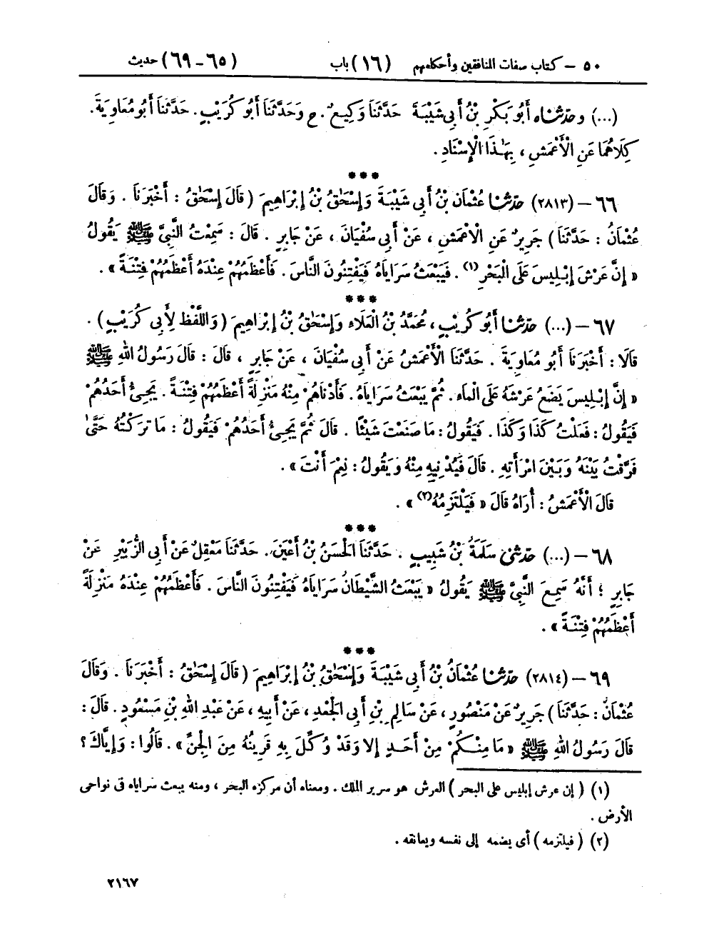 ٦٦ - (٢٨١٣) حَدَّثَنَا عُثْمَانُ بْنُ أَبِي شَيْبَةَ، وَإِسْحَاقُ بْنُ إِبْرَاهِيمَ - قَالَ إِسْحَاقُ: أَخْبَرَنَا، وقَالَ عُثْمَانُ: حَدَّثَنَا - جَرِيرٌ، عَنِ الْأَعْمَشِ، عَنْ أَبِي سُفْيَانَ، عَنْ جَابِرٍ، قَالَ: سَمِعْتُ النَّبِيَّ صَلَّى اللهُ عَلَيْهِ وَسَلَّمَ، يَقُولُ: «إِنَّ عَرْشَ إِبْلِيسَ عَلَى الْبَحْرِ، فَيَبْعَثُ سَرَايَاهُ فَيَفْتِنُونَ النَّاسَ، فَأَعْظَمُهُمْ عِنْدَهُ أَعْظَمُهُمْ فِتْنَةً»