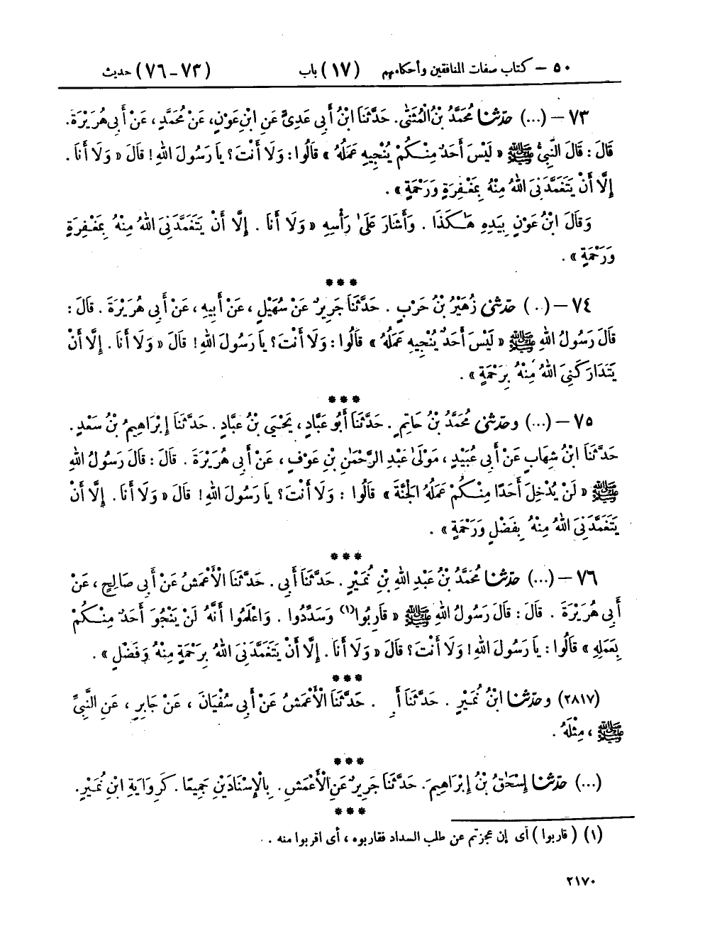 ٧٦ - (٢٨١٦) حَدَّثَنَا مُحَمَّدُ بْنُ عَبْدِ اللهِ بْنِ نُمَيْرٍ، حَدَّثَنَا أَبِي، حَدَّثَنَا الْأَعْمَشُ، عَنْ أَبِي صَالِحٍ، عَنْ أَبِي هُرَيْرَةَ، قَالَ: قَالَ رَسُولُ اللهِ صَلَّى اللهُ عَلَيْهِ وَسَلَّمَ: «قَارِبُوا وَسَدِّدُوا، وَاعْلَمُوا أَنَّهُ لَنْ يَنْجُوَ أَحَدٌ مِنْكُمْ بِعَمَلِهِ» قَالُوا: يَا رَسُولَ اللهِ وَلَا أَنْتَ؟ قَالَ: «وَلَا أَنَا، إِلَّا أَنْ يَتَغَمَّدَنِيَ اللهُ بِرَحْمَةٍ مِنْهُ وَفَضْلٍ»،
