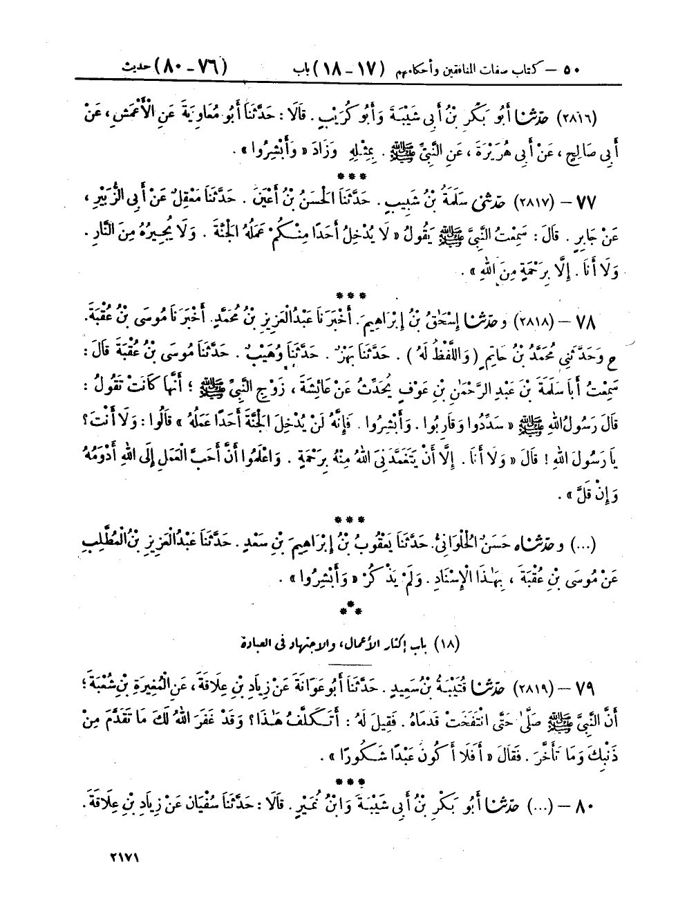 ٧٨ - (٢٨١٨) وَحَدَّثَنَا إِسْحَاقُ بْنُ إِبْرَاهِيمَ، أَخْبَرَنَا عَبْدُ الْعَزِيزِ بْنُ مُحَمَّدٍ، أَخْبَرَنَا مُوسَى بْنُ عُقْبَةَ، ح وحَدَّثَنِي مُحَمَّدُ بْنُ حَاتِمٍ - وَاللَّفْظُ لَهُ - حَدَّثَنَا بَهْزٌ، حَدَّثَنَا وُهَيْبٌ، حَدَّثَنَا مُوسَى بْنُ عُقْبَةَ، قَالَ: سَمِعْتُ أَبَا سَلَمَةَ بْنَ عَبْدِ الرَّحْمَنِ بْنِ عَوْفٍ، يُحَدِّثُ عَنْ عَائِشَةَ زَوْجِ النَّبِيِّ صَلَّى اللهُ عَلَيْهِ وَسَلَّمَ، أَنَّهَا كَانَتْ تَقُولُ: قَالَ رَسُولُ اللهِ صَلَّى اللهُ عَلَيْهِ وَسَلَّمَ: «سَدِّدُوا وَقَارِبُوا، وَأَبْشِرُوا، فَإِنَّهُ لَنْ يُدْخِلَ الْجَنَّةَ أَحَدًا عَمَلُهُ» قَالُوا: وَلَا أَنْتَ؟ يَا رَسُولَ اللهِ قَالَ: «وَلَا أَنَا، إِلَّا أَنْ يَتَغَمَّدَنِيَ اللهُ مِنْهُ بِرَحْمَةٍ، وَاعْلَمُوا أَنَّ أَحَبَّ الْعَمَلِ إِلَى اللهِ أَدْوَمُهُ وَإِنْ قَلَّ»،