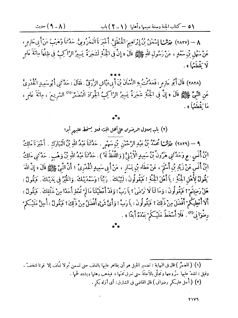 ٩ - (٢٨٢٩) حَدَّثَنَا مُحَمَّدُ بْنُ عَبْدِ الرَّحْمَنِ بْنِ سَهْمٍ، حَدَّثَنَا عَبْدُ اللهِ بْنُ الْمُبَارَكِ، أَخْبَرَنَا مَالِكُ بْنُ أَنَسٍ، ح وحَدَّثَنِي هَارُونُ بْنُ سَعِيدٍ الْأَيْلِيُّ - وَاللَّفْظُ لَهُ - حَدَّثَنَا عَبْدُ اللهِ بْنُ وَهْبٍ، حَدَّثَنِي مَالِكُ بْنُ أَنَسٍ، عَنْ زَيْدِ بْنِ أَسْلَمَ، عَنْ عَطَاءِ بْنِ يَسَارٍ، عَنْ أَبِي سَعِيدٍ الْخُدْرِيِّ، أَنَّ النَّبِيَّ صَلَّى اللهُ عَلَيْهِ وَسَلَّمَ قَالَ: " إِنَّ اللهَ يَقُولُ لِأَهْلِ الْجَنَّةِ: يَا أَهْلَ الْجَنَّةِ فَيَقُولُونَ: لَبَّيْكَ رَبَّنَا وَسَعْدَيْكَ وَالْخَيْرُ فِي يَدَيْكَ فَيَقُولُ: هَلْ رَضِيتُمْ؟ فَيَقُولُونَ: وَمَا لَنَا لَا نَرْضَى؟ يَا رَبِّ وَقَدْ أَعْطَيْتَنَا مَا لَمْ تُعْطِ أَحَدًا مِنْ خَلْقِكَ، فَيَقُولُ: أَلَا أُعْطِيكُمْ أَفْضَلَ مِنْ ذَلِكَ؟ فَيَقُولُونَ: يَا رَبِّ وَأَيُّ شَيْءٍ أَفْضَلُ مِنْ ذَلِكَ؟ فَيَقُولُ: أُحِلُّ عَلَيْكُمْ رِضْوَانِي، فَلَا أَسْخَطُ عَلَيْكُمْ بَعْدَهُ أَبَدًا "