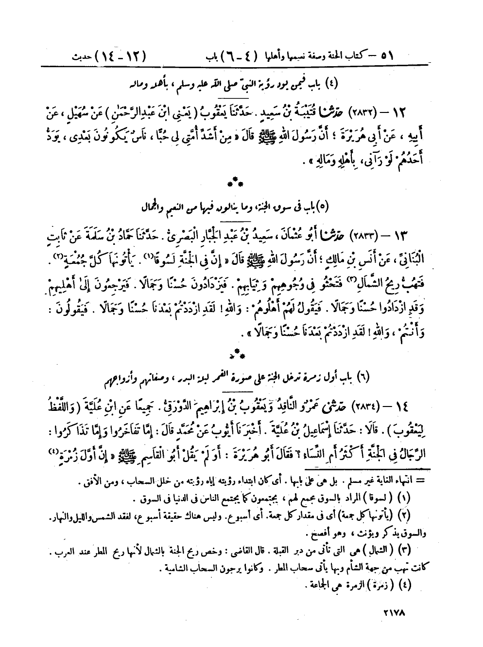 ١٣ - (٢٨٣٣) حَدَّثَنَا أَبُو عُثْمَانَ سَعِيدُ بْنُ عَبْدِ الْجَبَّارِ الْبَصْرِيُّ، حَدَّثَنَا حَمَّادُ بْنُ سَلَمَةَ، عَنْ ثَابِتٍ الْبُنَانِيِّ، عَنْ أَنَسِ بْنِ مَالِكٍ، أَنَّ رَسُولَ اللهِ صَلَّى اللهُ عَلَيْهِ وَسَلَّمَ قَالَ: " إِنَّ فِي الْجَنَّةِ لَسُوقًا، يَأْتُونَهَا كُلَّ جُمُعَةٍ، فَتَهُبُّ رِيحُ الشَّمَالِ فَتَحْثُو فِي وُجُوهِهِمْ وَثِيَابِهِمْ، فَيَزْدَادُونَ حُسْنًا وَجَمَالًا، فَيَرْجِعُونَ إِلَى أَهْلِيهِمْ وَقَدِ ازْدَادُوا حُسْنًا وَجَمَالًا، فَيَقُولُ لَهُمْ أَهْلُوهُمْ: وَاللهِ لَقَدِ ازْدَدْتُمْ بَعْدَنَا حُسْنًا وَجَمَالًا، فَيَقُولُونَ: وَأَنْتُمْ، وَاللهِ لَقَدِ ازْدَدْتُمْ بَعْدَنَا حُسْنًا وَجَمَالًا "