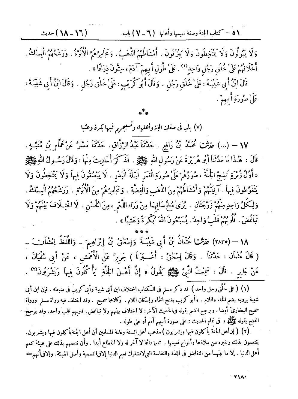 ١٧ - (٢٨٣٤) حَدَّثَنَا مُحَمَّدُ بْنُ رَافِعٍ، حَدَّثَنَا عَبْدُ الرَّزَّاقِ، حَدَّثَنَا مَعْمَرٌ، عَنْ هَمَّامِ بْنِ مُنَبِّهٍ، قَالَ: هَذَا مَا حَدَّثَنَا أَبُو هُرَيْرَةَ، عَنْ رَسُولِ اللهِ صَلَّى اللهُ عَلَيْهِ وَسَلَّمَ فَذَكَرَ أَحَادِيثَ مِنْهَا، وَقَالَ رَسُولُ اللهِ صَلَّى اللهُ عَلَيْهِ وَسَلَّمَ: «أَوَّلُ زُمْرَةٍ تَلِجُ الْجَنَّةَ، صُوَرُهُمْ عَلَى صُورَةِ الْقَمَرِ لَيْلَةَ الْبَدْرِ، لَا يَبْصُقُونَ فِيهَا وَلَا يَمْتَخِطُونَ وَلَا يَتَغَوَّطُونَ فِيهَا، آنِيَتُهُمْ وَأَمْشَاطُهُمْ مِنَ الذَّهَبِ وَالْفِضَّةِ، وَمَجَامِرُهُمْ مِنَ الْأَلُوَّةِ، وَرَشْحُهُمُ الْمِسْكُ وَلِكُلِّ وَاحِدٍ مِنْهُمْ زَوْجَتَانِ، يُرَى مُخُّ سَاقِهِمَا مِنْ وَرَاءِ اللَّحْمِ، مِنَ الْحُسْنِ، لَا اخْتِلَافَ بَيْنَهُمْ وَلَا تَبَاغُضَ، قُلُوبُهُمْ قَلْبٌ وَاحِدٌ، يُسَبِّحُونَ اللهَ بُكْرَةً وَعَشِيًّا»