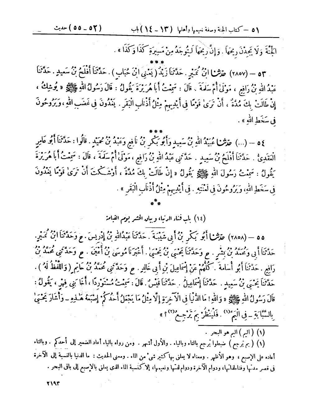 ٥٣ - (٢٨٥٧) حَدَّثَنَا ابْنُ نُمَيْرٍ، حَدَّثَنَا زَيْدٌ يَعْنِي ابْنَ حُبَابٍ، حَدَّثَنَا أَفْلَحُ بْنُ سَعِيدٍ، حَدَّثَنَا عَبْدُ اللهِ بْنُ رَافِعٍ، مَوْلَى أُمِّ سَلَمَةَ، قَالَ: سَمِعْتُ أَبَا هُرَيْرَةَ، يَقُولُ: قَالَ رَسُولُ اللهِ صَلَّى اللهُ عَلَيْهِ وَسَلَّمَ: «يُوشِكُ، إِنْ طَالَتْ بِكَ مُدَّةٌ، أَنْ تَرَى قَوْمًا فِي أَيْدِيهِمْ مِثْلُ أَذْنَابِ الْبَقَرِ، يَغْدُونَ فِي غَضَبِ اللهِ، وَيَرُوحُونَ فِي سَخَطِ اللهِ»