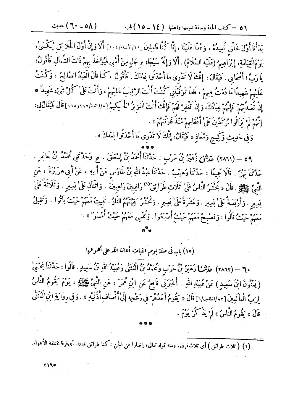 ٥٩ - (٢٨٦١) حَدَّثَنِي زُهَيْرُ بْنُ حَرْبٍ، حَدَّثَنَا أَحْمَدُ بْنُ إِسْحَاقَ، ح وحَدَّثَنِي مُحَمَّدُ بْنُ حَاتِمٍ، حَدَّثَنَا بَهْزٌ، قَالَا: جَمِيعًا حَدَّثَنَا وُهَيْبٌ، حَدَّثَنَا عَبْدُ اللهِ بْنُ طَاوُسٍ، عَنْ أَبِيهِ، عَنْ أَبِي هُرَيْرَةَ، عَنِ النَّبِيِّ صَلَّى اللهُ عَلَيْهِ وَسَلَّمَ، قَالَ: «يُحْشَرُ النَّاسُ عَلَى ثَلَاثِ طَرَائِقَ، رَاغِبِينَ رَاهِبِينً، وَاثْنَانِ عَلَى بَعِيرٍ، وَثَلَاثَةٌ عَلَى بَعِيرٍ، وَأَرْبَعَةٌ عَلَى بَعِيرٍ، وَعَشَرَةٌ عَلَى بَعِيرٍ، وَتَحْشُرُ بَقِيَّتَهُمُ النَّارُ تَبِيتُ مَعَهُمْ، حَيْثُ بَاتُوا وَتَقِيلُ مَعَهُمْ حَيْثُ قَالُوا، وَتُصْبِحُ مَعَهُمْ حَيْثُ أَصْبَحُوا، وَتُمْسِي مَعَهُمْ حَيْثُ أَمْسَوْا»
