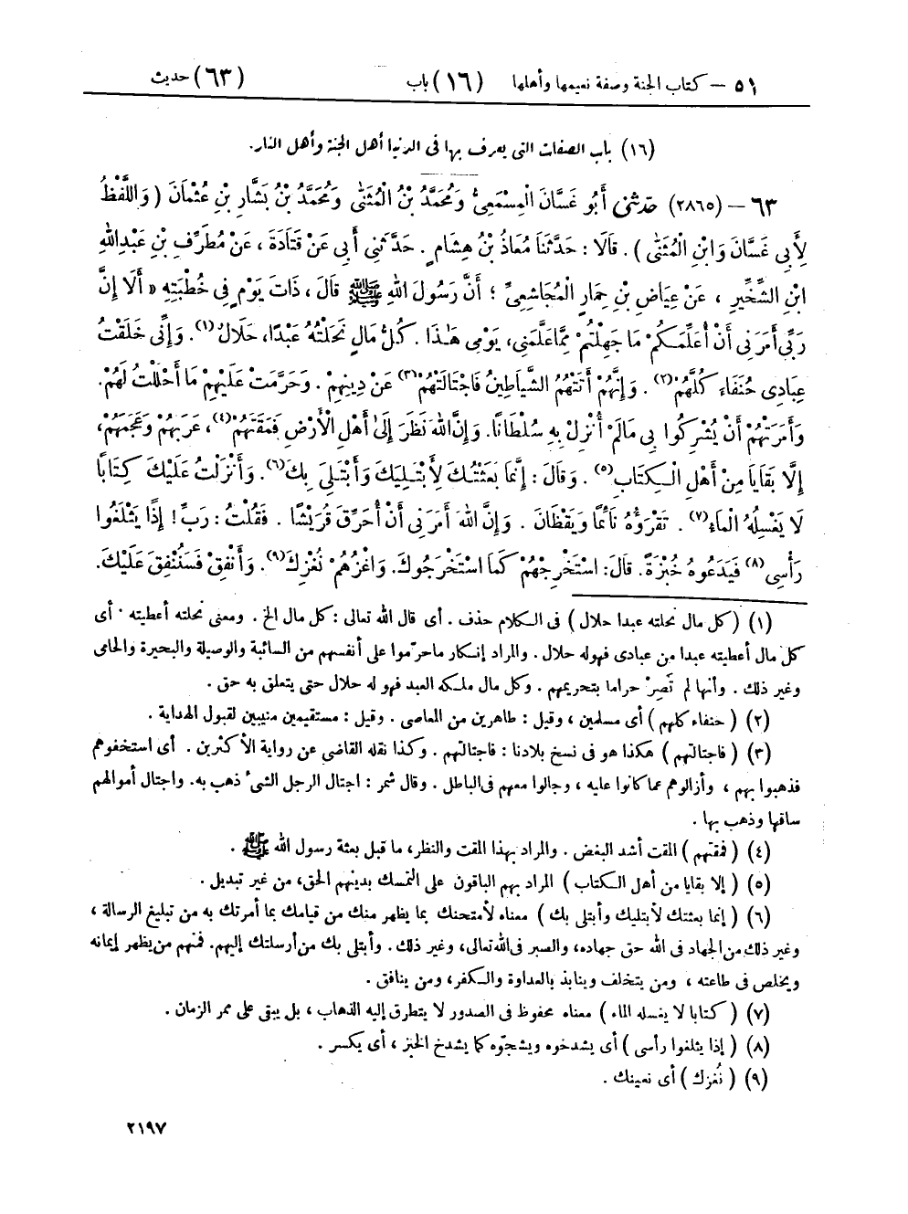 [ ش (كل مال نحلته عبدا حلال) في الكلام حذف أي قال الله تعالى كل مال الخ ومعنى نحلته أعطيته أي كل مال أعطيته عبدا من عبادي فهو له حلال والمراد إنكار ما حرموا على أنفسهم من السائبة والوصيلة والبحيرة والحامي وغير ذلك وأنها لم تصر حراما بتحريمهم وكل مال ملكه العبد فهو له حلال حتى يتعلق به حق (حنفاء كلهم) أي مسلمين وقيل طاهرين من المعاصي وقيل مستقيمين منيبين لقبول الهداية (فاجتالتهم) هكذا هو في نسخ بلادنا فاجتالتهم وكذا نقله القاضي عن رواية الأكثرين أي استخفوهم فذهبوا بهم وأزالوهم عما كانوا عليه وجالوا معهم في الباطل وقال شمر اجتال الرجل الشيء ذهب به واجتال أموالهم ساقها وذهب بها (فمقتهم) المقت أشد البغض والمراد بهذا المقت والنظر ما قبل بعثة رسول الله صلى الله عليه وسلم (إلا بقايا من أهل الكتاب) المراد بهم الباقون على التمسك بدينهم الحق من غير تبديل (إنما بعثتك لأبتليك وأبتلي بك) معناه لأمتحنك بما يظهر منك من قيامك بما أمرتك به من تبليغ الرسالة وغير ذلك من الجهاد في الله حق جهاده والصبر في الله تعالى وغير ذلك وأبتلي بك من أرسلتك إليهم فمنهم من يظهر إيمانه ويخلص في طاعته ومن يتخلف وينابذ بالعداوة والكفر ومن ينافق (كتابا لا يغسله الماء) معناه محفوظ في الصدور لا يتطرق إليه الذهاب بل يبقى على ممر الزمان (إذا يثلغوا رأسي) أي يشدخوه ويشجوه كما يشدخ الخبز أي يكسر (نغزك) أي نعينك (لا زبر له) أي لا عقل له يزبره ويمنعه مما لا ينبغي وقيل هو الذي لا مال له وقيل الذي ليس عنده ما يعتمده (لا يتبعون) مخفف ومشدد من الاتباع أي يتبعون ويتبعون وفي بعض النسخ يبتغون أي يطلبون (والخائن الذي لا يخفى له طمع) معنى لا يخفى لا يظهر قال أهل اللغة يقال خفيت الشيء إذا أظهرته وأخفيته إذا سترته وكتمته هذا هو المشهور وقيل هما لغتان فيهما جميعا (وذكر البخل أو الكذب) هكذا هو في أكثر النسخ أو الكذب وفي بعضها والكذب والأول هو المشهور في نسخ بلادنا (الشنظير) فسره في الحديث بأنه الفحاش وهو السيئ الخلق]