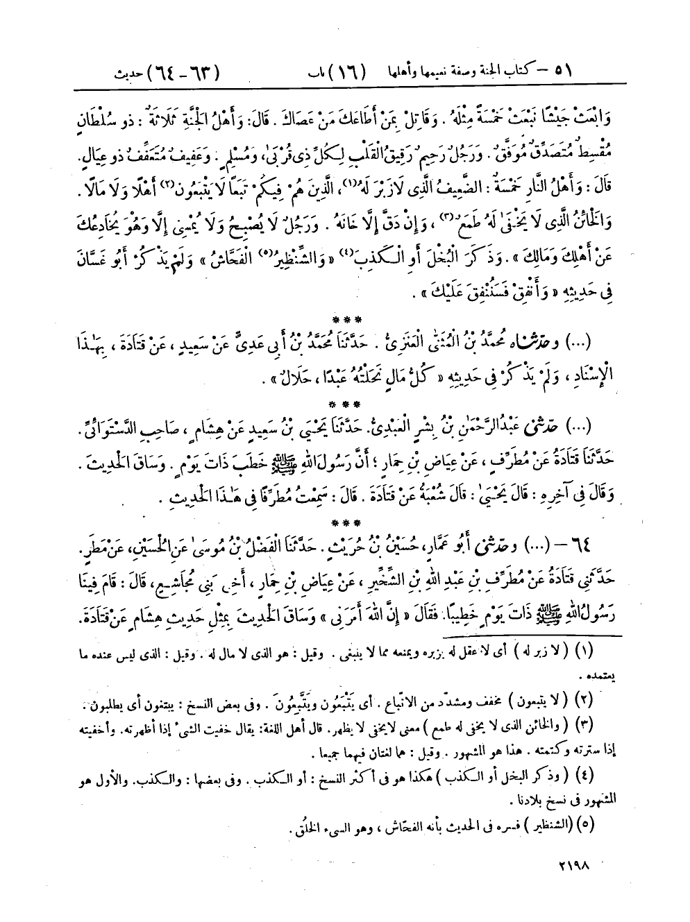 ٦٤ - (٢٨٦٥) وحَدَّثَنِي أَبُو عَمَّارٍ حُسَيْنُ بْنُ حُرَيْثٍ، حَدَّثَنَا الْفَضْلُ بْنُ مُوسَى، عَنِ الْحُسَيْنِ، عَنْ مَطَرٍ، حَدَّثَنِي قَتَادَةُ، عَنْ مُطَرِّفِ بْنِ عَبْدِ اللهِ بْنِ الشِّخِّيرِ، عَنْ عِيَاضِ بْنِ حِمَارٍ أَخِي بَنِي مُجَاشِعٍ، قَالَ: قَامَ فِينَا رَسُولُ اللهِ صَلَّى اللهُ عَلَيْهِ وَسَلَّمَ ذَاتَ يَوْمٍ خَطِيبًا، فَقَالَ: «إِنَّ اللهَ أَمَرَنِي» وَسَاقَ الْحَدِيثَ بِمِثْلِ حَدِيثِ هِشَامٍ، عَنْ قَتَادَةَ، وَزَادَ فِيهِ «وَإِنَّ اللهَ أَوْحَى إِلَيَّ أَنْ تَوَاضَعُوا حَتَّى لَا يَفْخَرَ أَحَدٌ عَلَى أَحَدٍ، وَلَا يَبْغِي أَحَدٌ عَلَى أَحَدٍ» وَقَالَ فِي حَدِيثِهِ «وَهُمْ فِيكُمْ تَبَعًا لَا يَبْغُونَ أَهْلًا وَلَا مَالًا»، فَقُلْتُ: فَيَكُونُ ذَلِكَ؟ يَا أَبَا عَبْدِ اللهِ قَالَ: نَعَمْ، وَاللهِ لَقَدْ أَدْرَكْتُهُمْ فِي الْجَاهِلِيَّةِ، وَإِنَّ الرَّجُلَ لَيَرْعَى عَلَى الْحَيِّ، مَا بِهِ إِلَّا وَلِيدَتُهُمْ يَطَؤُهَا