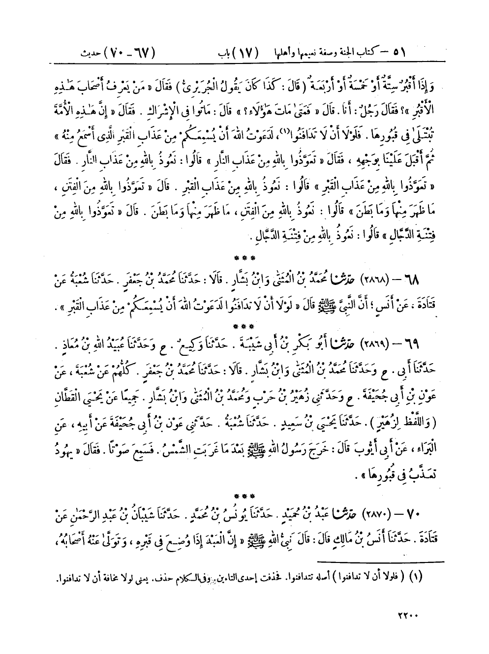 ٦٨ - (٢٨٦٨) حَدَّثَنَا مُحَمَّدُ بْنُ الْمُثَنَّى، وَابْنُ بَشَّارٍ، قَالَا: حَدَّثَنَا مُحَمَّدُ بْنُ جَعْفَرٍ، حَدَّثَنَا شُعْبَةُ، عَنْ قَتَادَةَ، عَنْ أَنَسٍ، أَنَّ النَّبِيَّ صَلَّى اللهُ عَلَيْهِ وَسَلَّمَ، قَالَ: «لَوْلَا أَنْ لَا تَدَافَنُوا لَدَعَوْتُ اللهَ أَنْ يُسْمِعَكُمْ مِنْ عَذَابِ الْقَبْرِ»