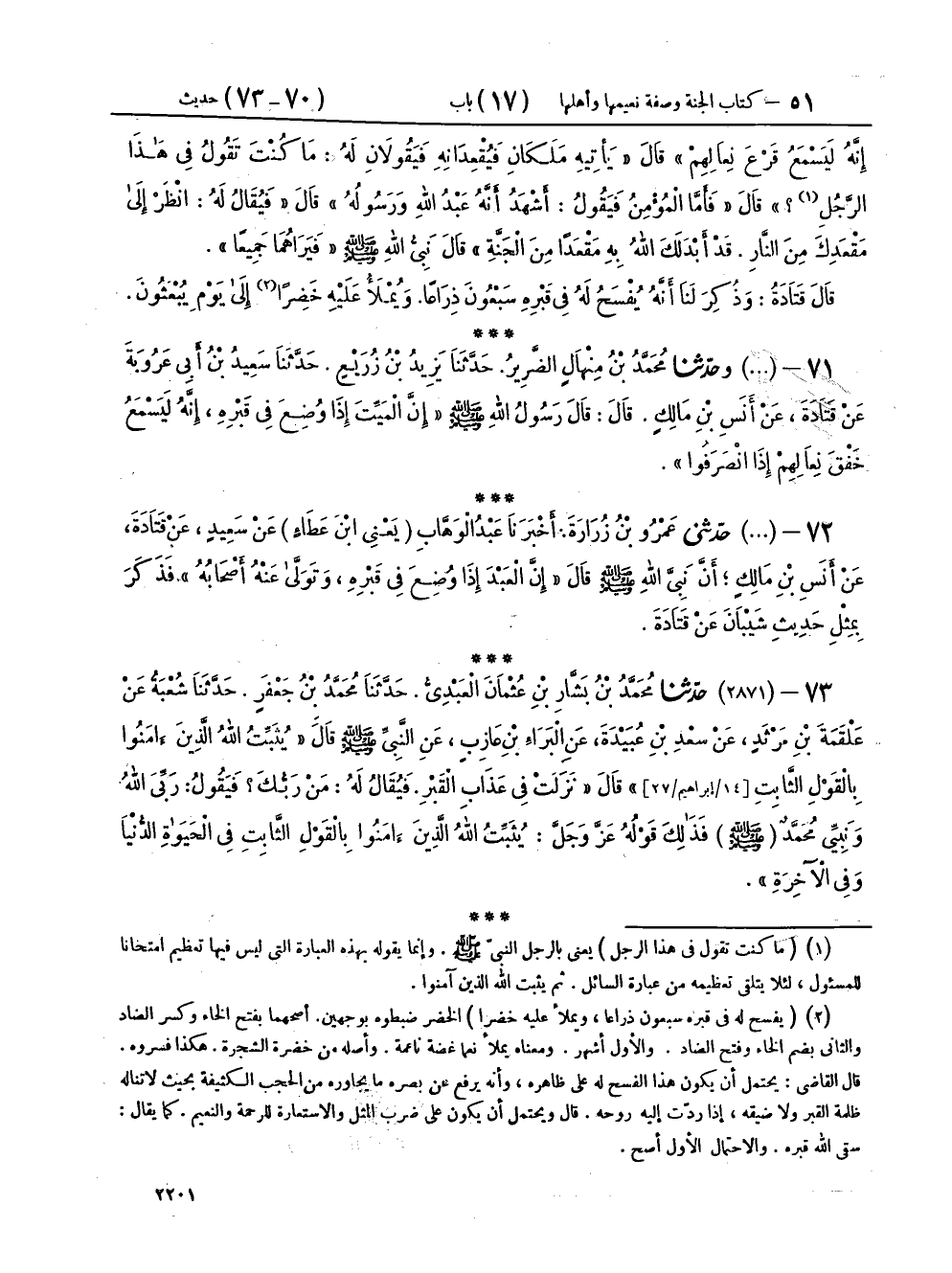٧١ - (٢٨٧٠) وَحَدَّثَنَا مُحَمَّدُ بْنُ مِنْهَالٍ الضَّرِيرُ، حَدَّثَنَا يَزِيدُ بْنُ زُرَيْعٍ، حَدَّثَنَا سَعِيدُ بْنُ أَبِي عَرُوبَةَ، عَنْ قَتَادَةَ، عَنْ أَنَسِ بْنِ مَالِكٍ، قَالَ: قَالَ رَسُولُ اللهِ صَلَّى اللهُ عَلَيْهِ وَسَلَّمَ: «إِنَّ الْمَيِّتَ إِذَا وُضِعَ فِي قَبْرِهِ، إِنَّهُ لَيَسْمَعُ خَفْقَ نِعَالِهِمْ إِذَا انْصَرَفُوا»،