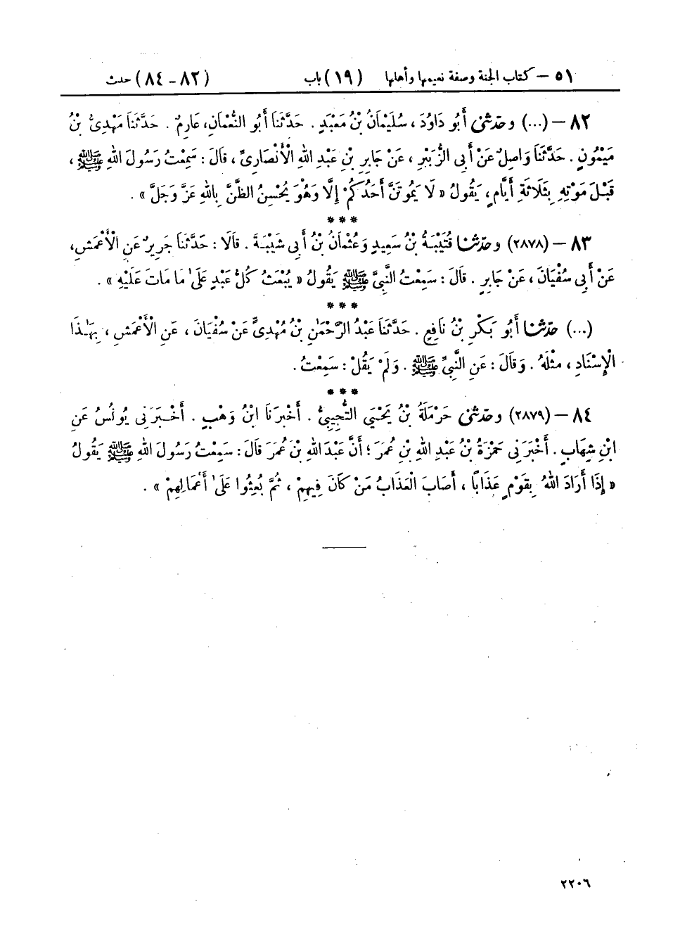 ٨٣ - (٢٨٧٨) وَحَدَّثَنَا قُتَيْبَةُ بْنُ سَعِيدٍ، وَعُثْمَانُ بْنُ أَبِي شَيْبَةَ، قَالَا: حَدَّثَنَا جَرِيرٌ، عَنِ الْأَعْمَشِ، عَنْ أَبِي سُفْيَانَ، عَنْ جَابِرٍ، قَالَ: سَمِعْتُ النَّبِيَّ صَلَّى اللهُ عَلَيْهِ وَسَلَّمَ، يَقُولُ: «يُبْعَثُ كُلُّ عَبْدٍ عَلَى مَا مَاتَ عَلَيْهِ»،