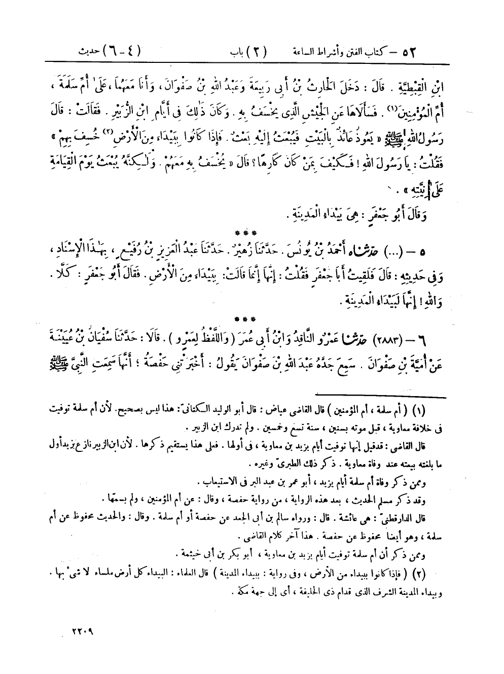 ٦ - (٢٨٨٣) حَدَّثَنَا عَمْرٌو النَّاقِدُ، وَابْنُ أَبِي عُمَرَ - وَاللَّفْظُ لِعَمْرٍو قَالَا: حَدَّثَنَا سُفْيَانُ بْنُ عُيَيْنَةَ، عَنْ أُمَيَّةَ بْنِ صَفْوَانَ، سَمِعَ جَدَّهُ عَبْدَ اللهِ بْنَ صَفْوَانَ، يَقُولُ: أَخْبَرَتْنِي حَفْصَةُ، أَنَّهَا سَمِعَتِ النَّبِيَّ صَلَّى اللهُ عَلَيْهِ وَسَلَّمَ، يَقُولُ: «لَيَؤُمَّنَّ هَذَا الْبَيْتَ جَيْشٌ يَغْزُونَهُ، حَتَّى إِذَا كَانُوا بِبَيْدَاءَ مِنَ الْأَرْضِ، يُخْسَفُ بِأَوْسَطِهِمْ وَيُنَادِي أَوَّلُهُمْ آخِرَهُمْ، ثُمَّ يُخْسَفُ بِهِمْ، فَلَا يَبْقَى إِلَّا الشَّرِيدُ الَّذِي يُخْبِرُ عَنْهُمْ» فَقَالَ رَجُلٌ: أَشْهَدُ عَلَيْكَ أَنَّكَ لَمْ تَكْذِبْ عَلَى حَفْصَةَ، وَأَشْهَدُ عَلَى حَفْصَةَ أَنَّهَا لَمْ تَكْذِبْ عَلَى النَّبِيِّ صَلَّى اللهُ عَلَيْهِ وَسَلَّمَ